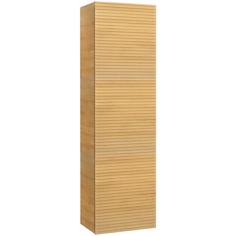 Подвесной пенал выполнен из МДФ в пленке ПВХ цвета светлый бук. С одной дверкой вертикального открывания и стеклянными и деревянными полками внутри.