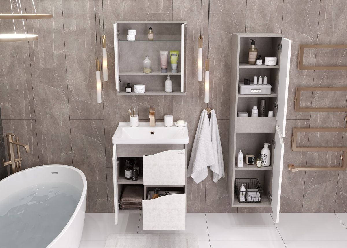 2 распашных дверцы оригинальной формы с механизмом плавного закрывания (одна их них зеркальная) скрывают отделение для хранения, внутреннее пространство которого поделено полками на 3 секции разной высоты, что позволяет удобно разместить все необходимые мелочи.