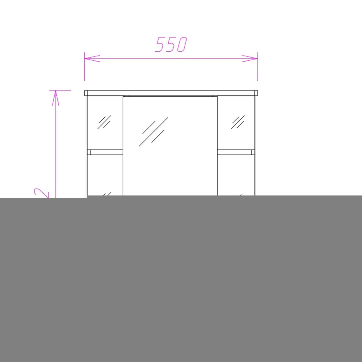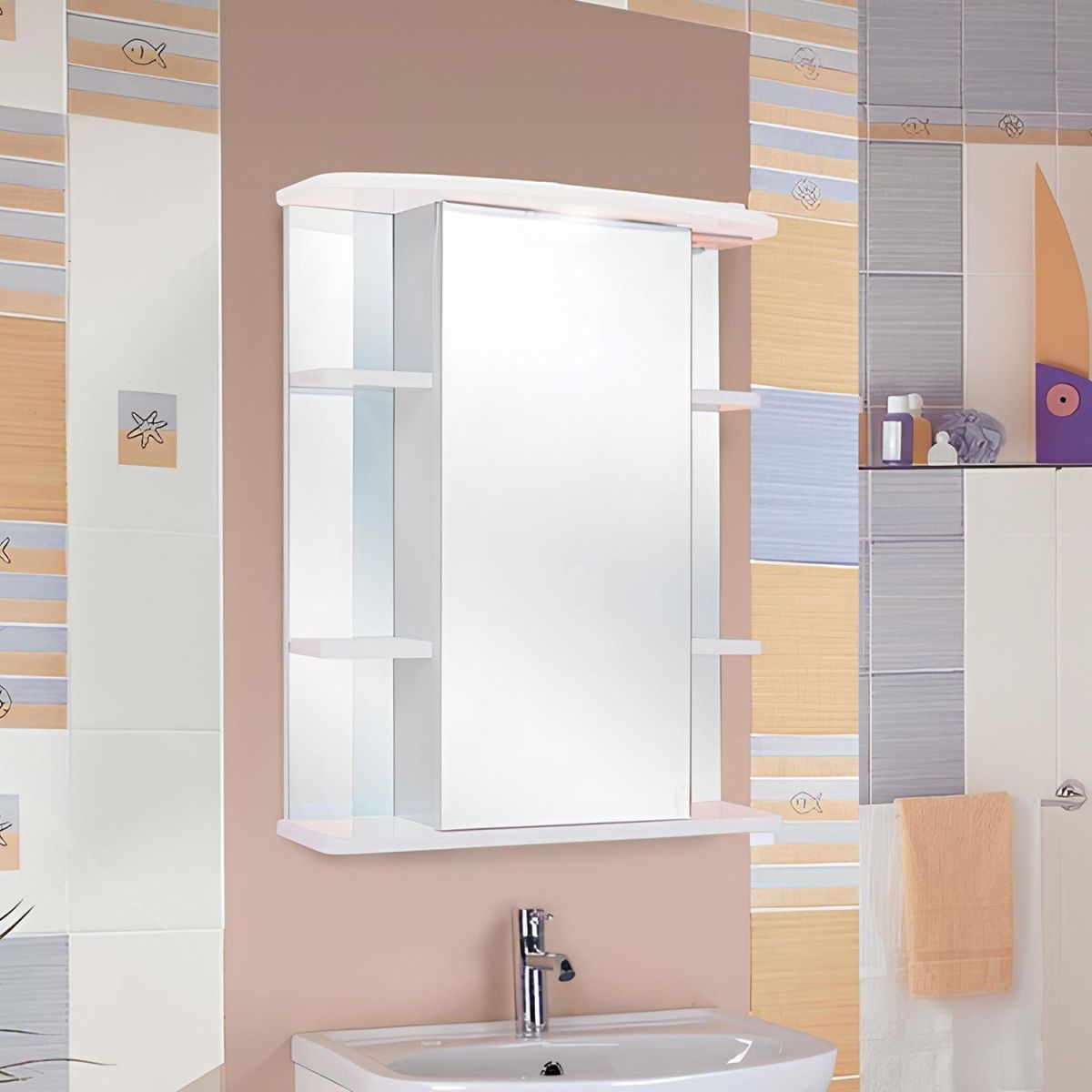 В центре шкафа - зеркальная дверца с механизмом плавного закрывания, за которой скрывается отделение для хранения, разделенное на две части горизонтальной полочкой. По бокам - открытые полочки для косметических средств или декоративных элементов.