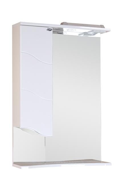 Слева от зеркала за распашной фигурной дверцей с изящной фрезеровкой и механизмом плавного закрывания расположено отделение для хранения, разделенное на две части горизонтальной полочкой, под зеркалом - открытая полочка для косметических средств или декоративных элементов.