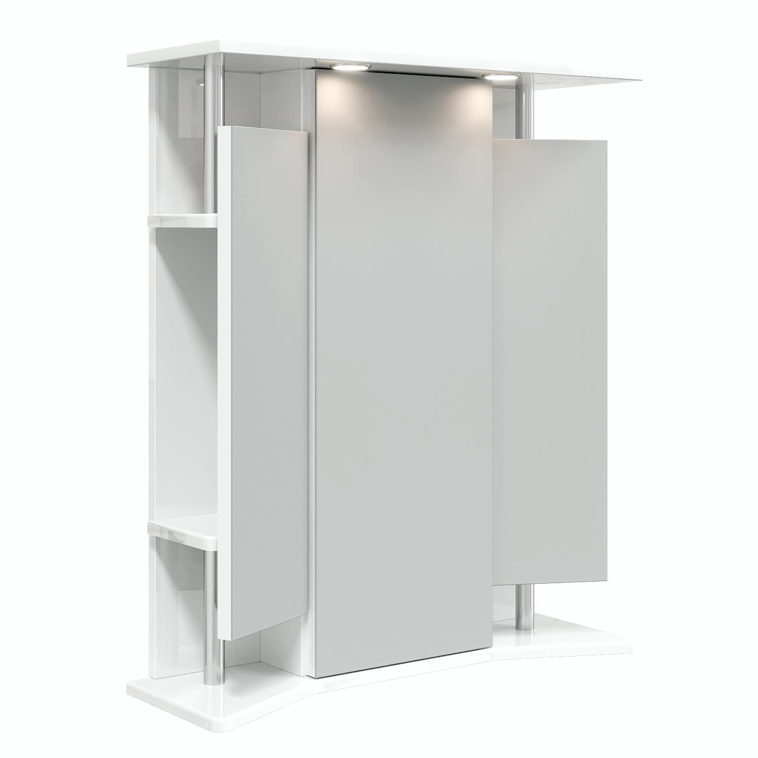 Зеркальные ставни по бокам от центрального отделения скрывают небольшие полочки, а хромированные вертикальные рейлинги придают конструкции устойчивость.