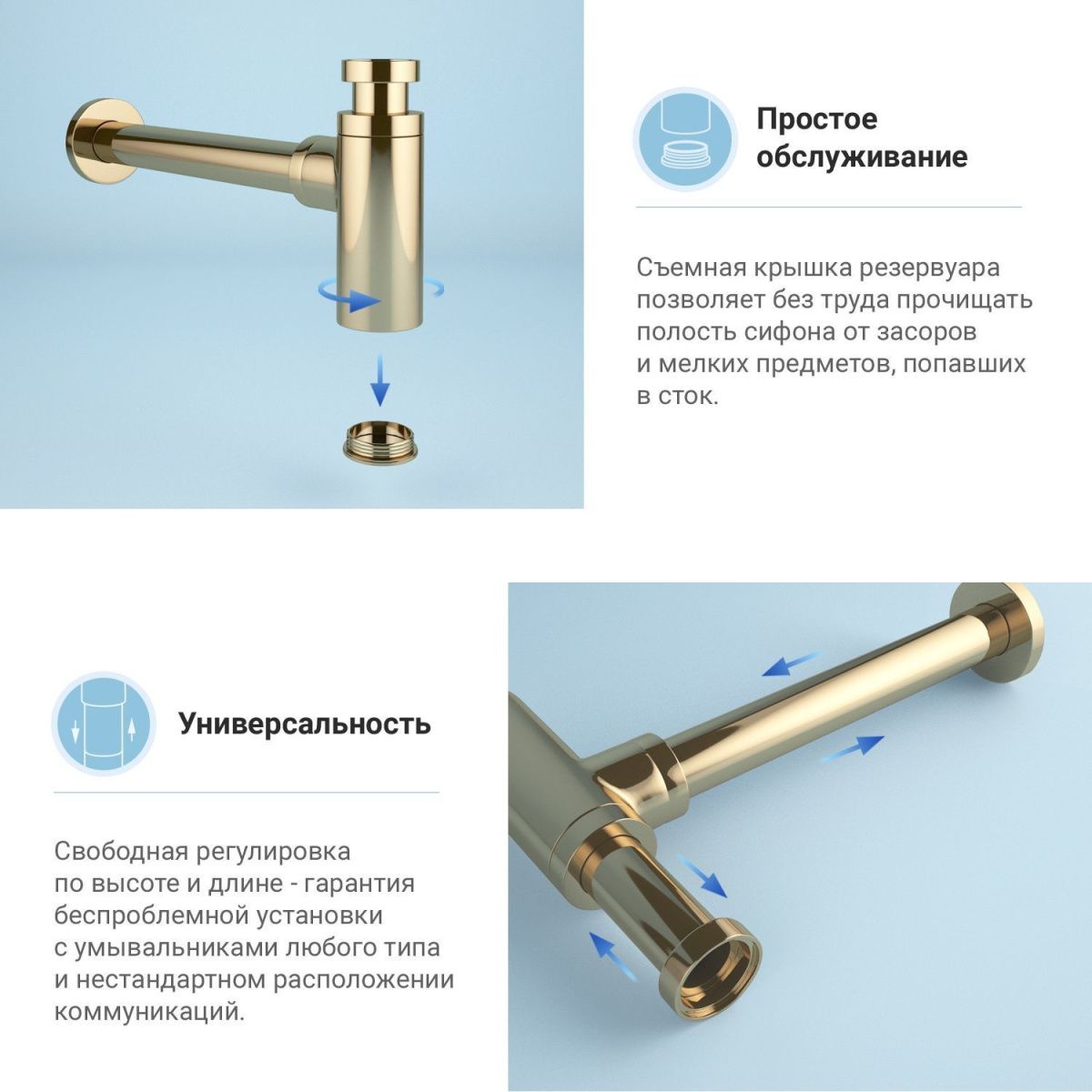 Выполненный из латуни сифон отличается высокой прочностью и долговечностью, устойчив к коррозии, повреждениям и высоким температурам. Внутренние стенки изделия имеют специальное защитное покрытие Protect’IN®, препятствующее скоплению грязи и оседанию водопроводных примесей и солей, что позволит продлить срок службы сифона, облегчит уход и снизит вероятность образования засоров.