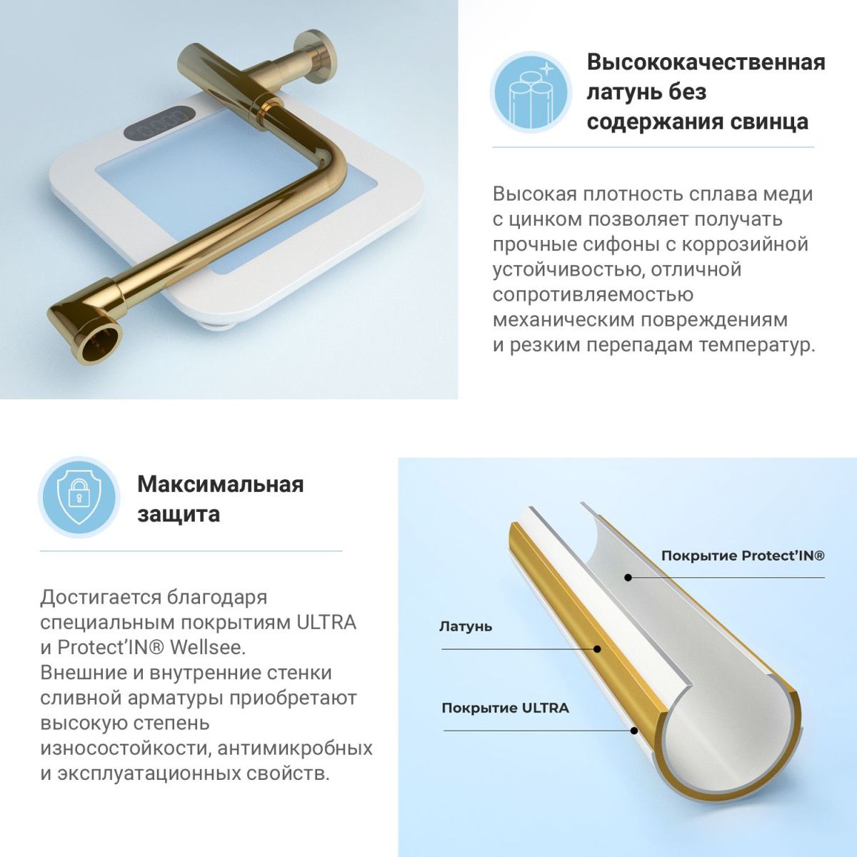 Выполненный из латуни сифон отличается высокой прочностью и долговечностью, устойчив к коррозии, повреждениям и высоким температурам. Внутренние стенки изделия имеют специальное защитное покрытие Protect’IN®, препятствующее скоплению грязи и оседанию водопроводных примесей и солей, что позволит продлить срок службы сифона, облегчит уход и снизит вероятность образования засоров.