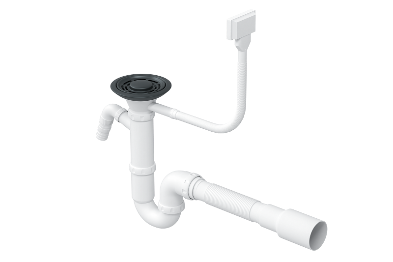 Сифон телескопической формы изготовлен из пластика. Он имеет прямоугольный перелив и слив диаметром 90 мм. Корпус белого цвета, а сливная корзина и перелив — чёрного. Сифон подходит для стальных моек Granula в чёрном цвете.