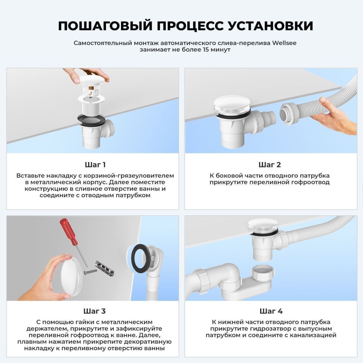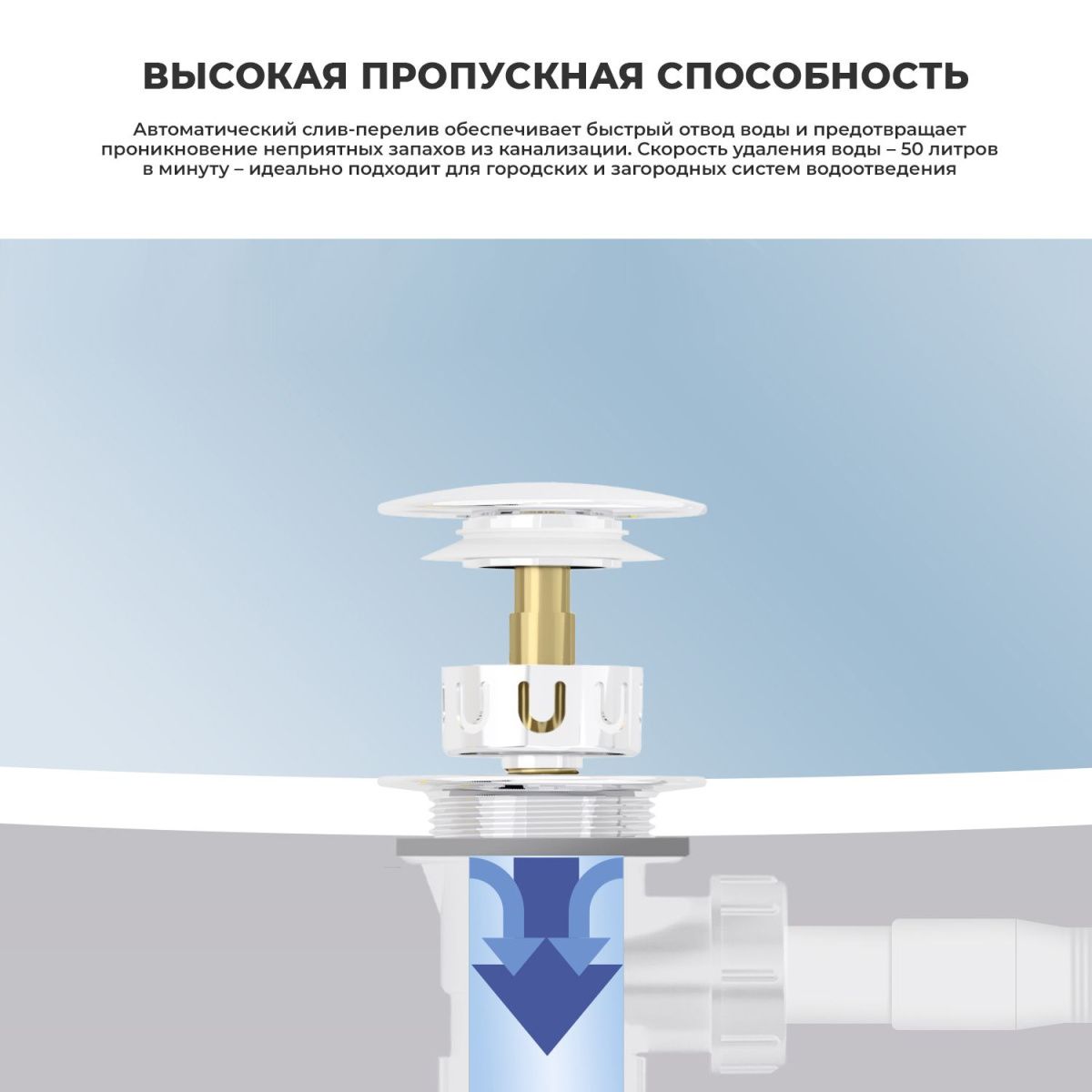 Продуманная конструкция слива-перелива Useful Extras от Wellsee обеспечивает простой монтаж и долгий срок службы. Самоочищающаяся форма и изгибы сифона поддерживают высокую пропускную способность — 50 л/мин. Функция верхней очистки позволяет с легкостью устранять засоры, а гидрозатвор служит барьером для канализационных газов.