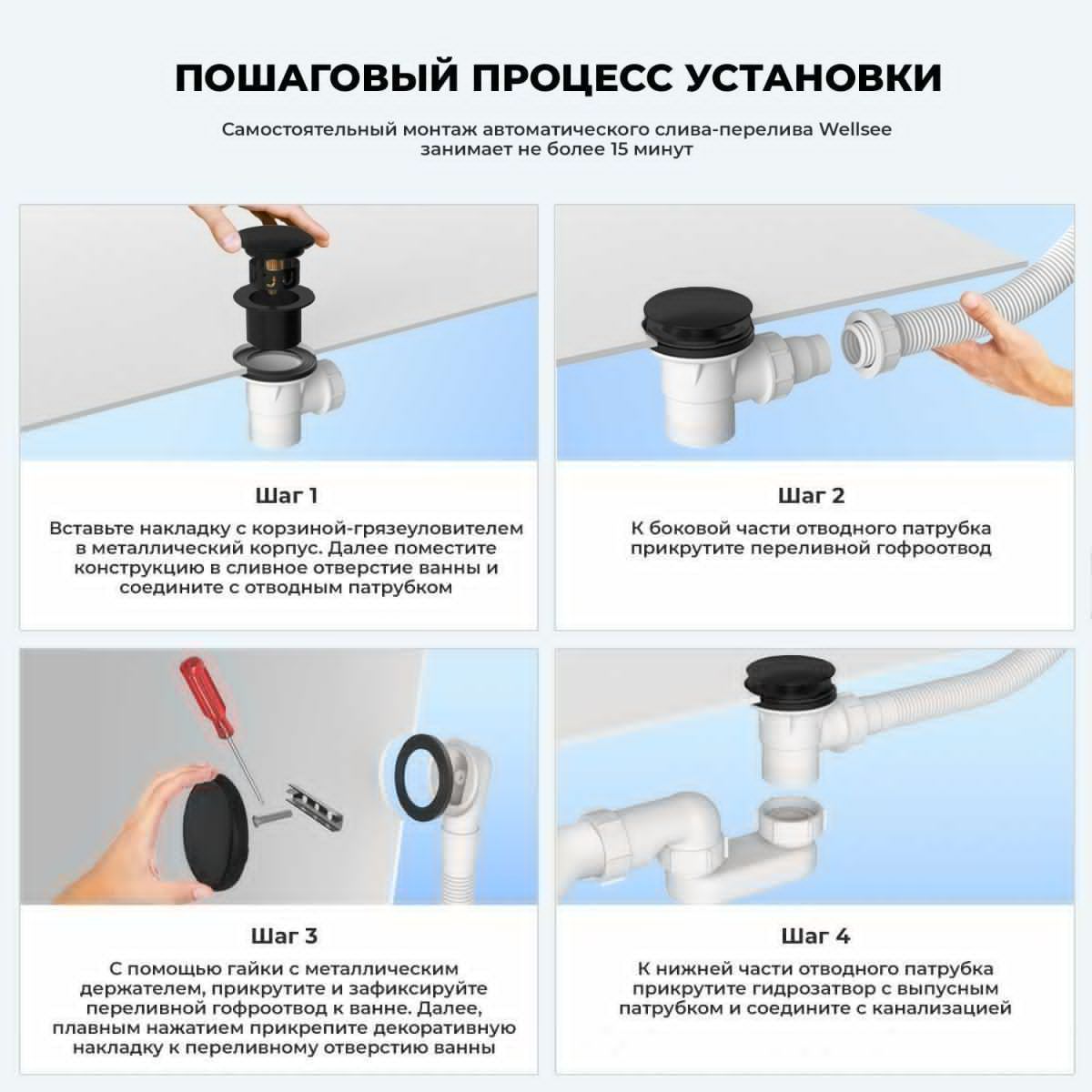 Продуманная конструкция слива-перелива Useful Extras от Wellsee обеспечивает простой монтаж и долгий срок службы. Самоочищающаяся форма и изгибы сифона поддерживают высокую пропускную способность — 50 л/мин. Функция верхней очистки позволяет с легкостью устранять засоры, а гидрозатвор служит барьером для канализационных газов.