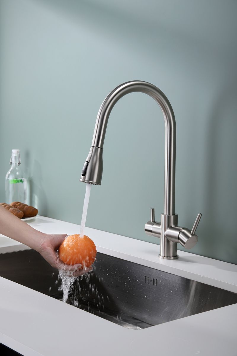 Смеситель для кухни SALIX c возможностью подключения системы фильтрации питьевой воды изготовлен из высококачественной латуни, которая отвечает высочайшим европейским стандартам качества, не содержит свинца, не разрушается со временем и безопасна для здоровья.