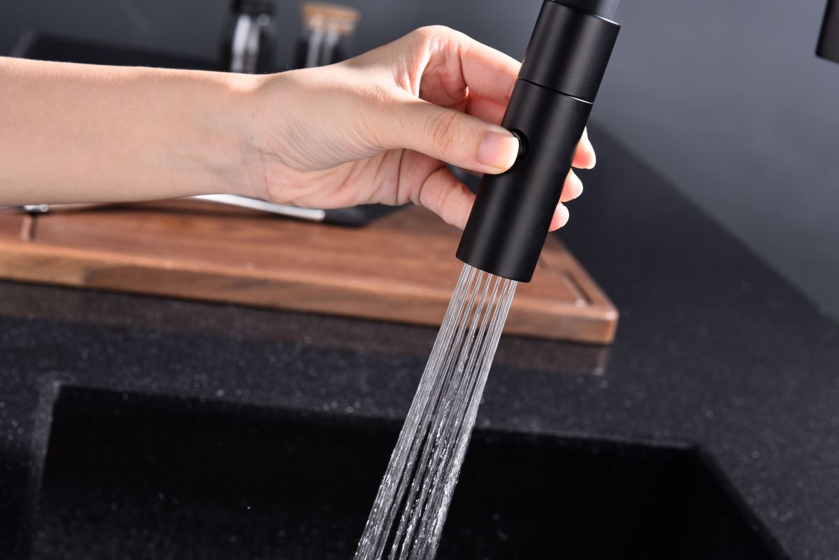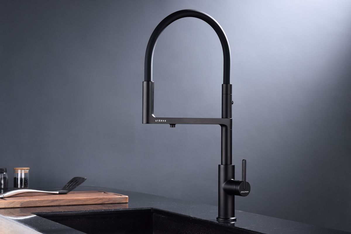 Гибкий силиконовый излив оснащен функцией деликатного душа и магнитным механизмом фиксации в задней части латунного корпуса. Он позволяет ополоснуть посуду или мойку в любой ее части или наполнить емкости даже на столе рядом с мойкой.