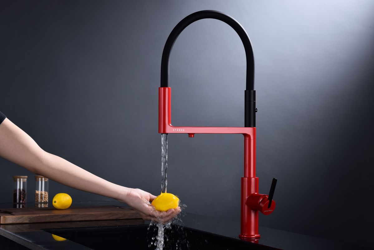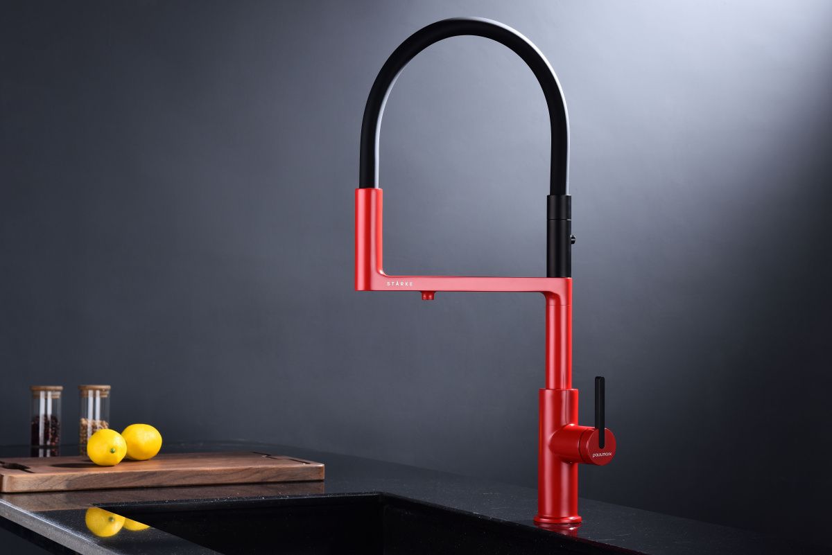 Гибкий силиконовый излив оснащен функцией деликатного душа и магнитным механизмом фиксации в задней части латунного корпуса. Он позволяет ополоснуть посуду или мойку в любой ее части или наполнить емкости даже на столе рядом с мойкой.