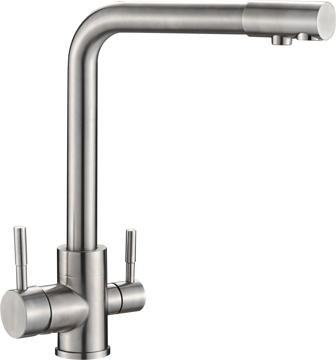 ULGRAN U-016 - высокоэргономичный кухонный смеситель с дополнительным краном для подключения фильтрованной воды, оснащенный кран-буксой с керамическими пластинами. Реализован тройной подвод воды через один излив: холодная, горячая и фильтрованная. Переход с одного подвода на другой производится поворотом рычага. Набор для соединения с фильтром входит в комплект . Система фильтрации приобретается дополнительно и монтируется под мойку, специальный индикатор сообщает о необходимости замены картриджа. Материал корпуса выполнен из высококачественной хирургической стали марки AISI 304. В качестве керамического картриджа используется известный бренд Wanhai диаметром 35 мм с высокой пропускной способностью в 500 тысяч циклов "открывания-закрывания".  На подвижные части картриджа  Wanhai  нанесена специальная невымываемая силиконовая смазка, а керамические пластины изготовлены из 96% оксида алюминия, что, в сочетании с высоким качеством шлифовки обеспечивает долговечность, надежность, плавность хода рукоятки.  Смеситель оборудован съемным пластиковым аэратором для экономии воды  и поворотным изливом на 360 градусов. В комплектацию входят:  керамический картридж  Wanhai, гибкая подводка, комплект крепежных элементов,  кран-букса с керамическими пластинами для дополнительного излива для фильтрованной воды, набор для подсоединения фильтра питьевой воды (гибкая подводка + переходник-цанга), технический паспорт и гарантийный талон. Заводская гарантия составляет 3 года на материал корпуса, 1 год на комплектующие к смесителю и 1 год на материал покрытия.
