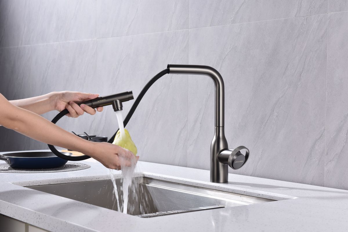 Высокий Г-образный излив с функцией вращения на 360 градусов обеспечивает удобство использования. Выдвижная часть излива способна обеспечить максимально комфортную эксплуатацию и экономный расход воды.