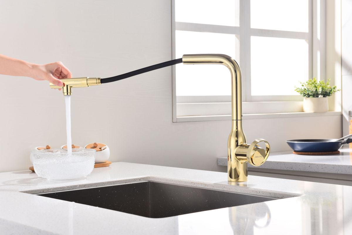 Высокий Г-образный излив с функцией вращения на 360 градусов обеспечивает удобство использования. Выдвижная часть излива способна обеспечить максимально комфортную эксплуатацию и экономный расход воды.