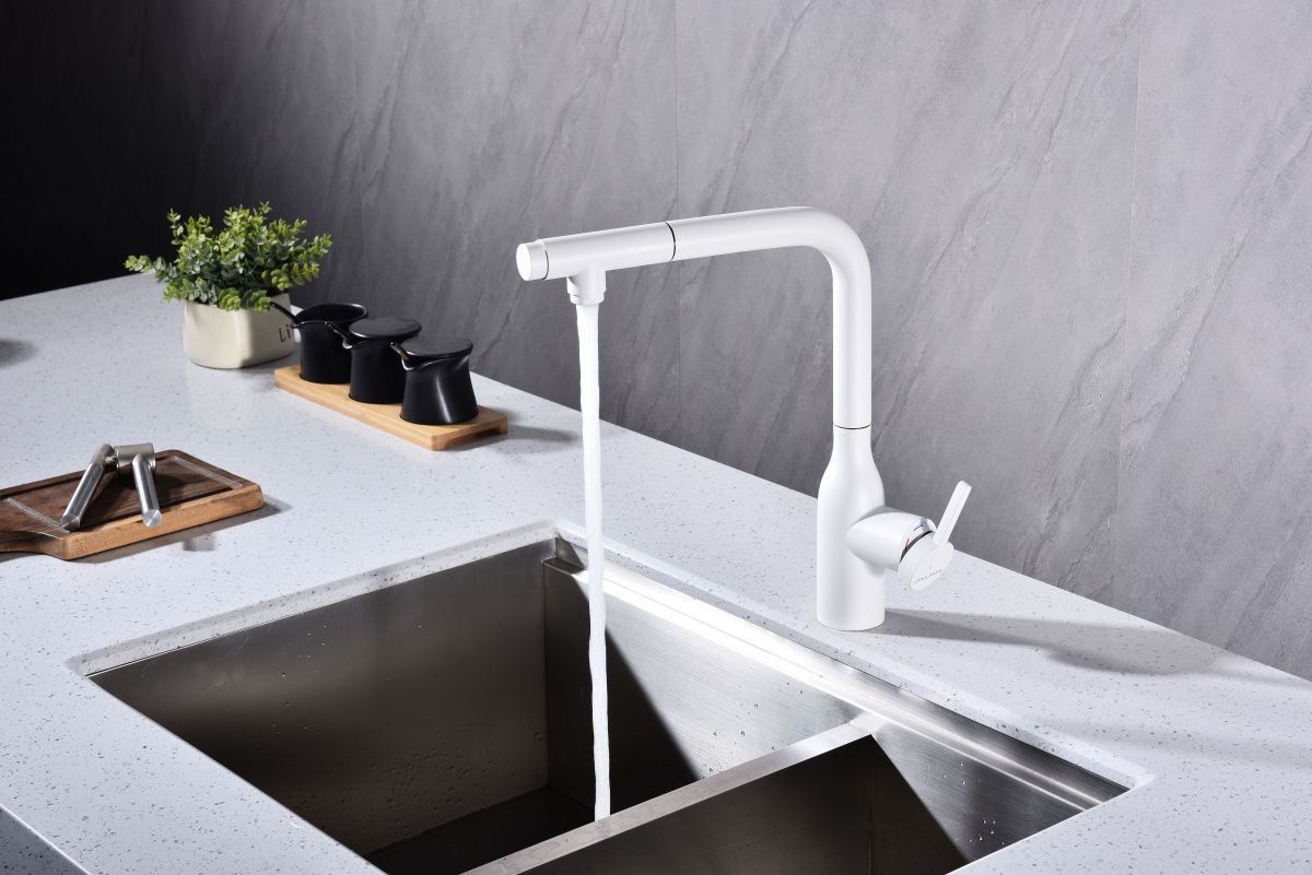 Высокий Г-образный излив с функцией вращения на 360 градусов обеспечивает удобство использования. Выдвижная часть излива способна обеспечить максимально комфортную эксплуатацию и экономный расход воды.