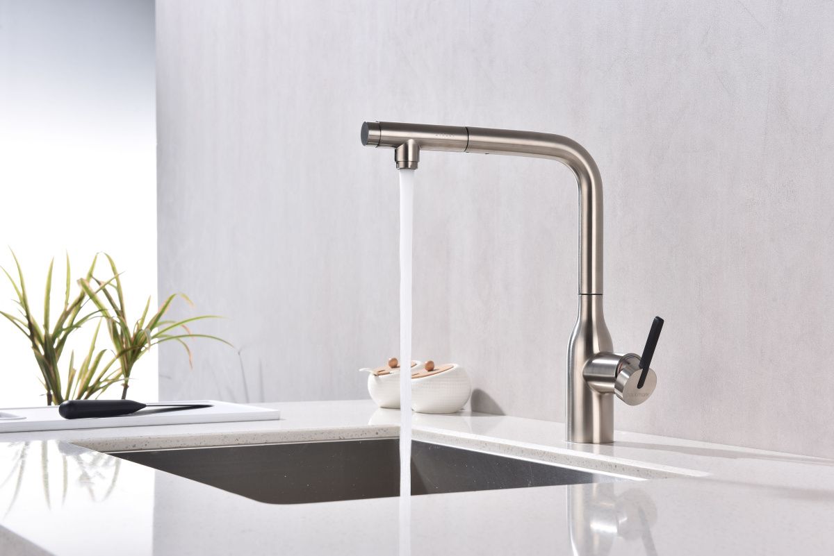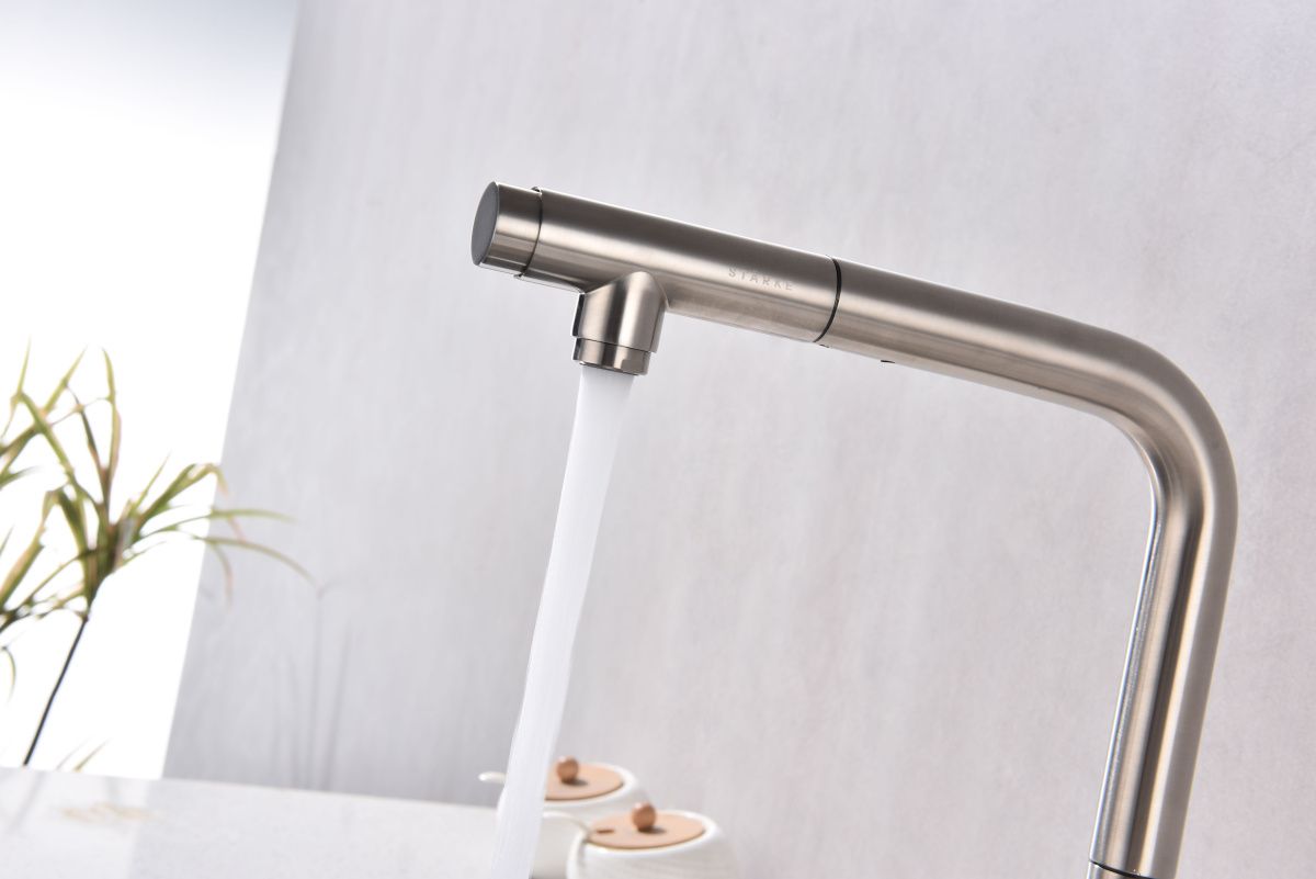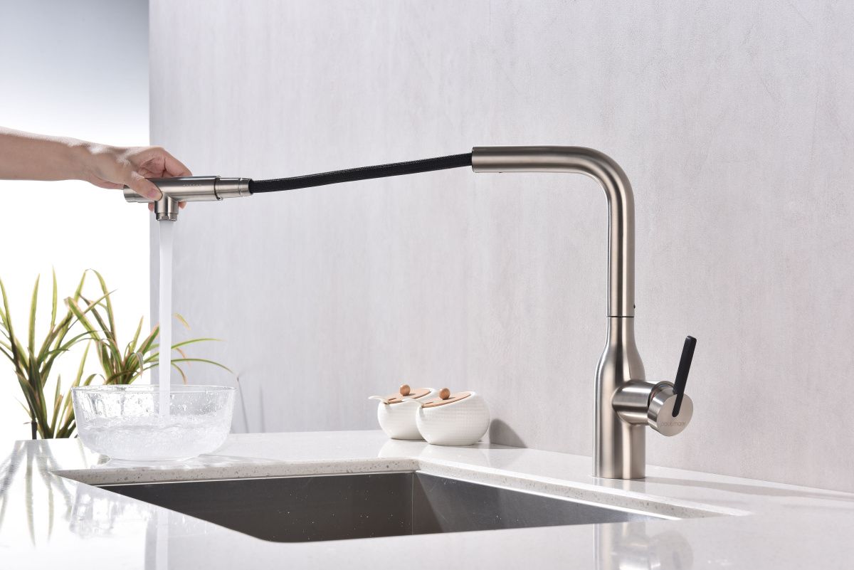 Высокий Г-образный излив с функцией вращения на 360 градусов обеспечивает удобство использования. Выдвижная часть излива способна обеспечить максимально комфортную эксплуатацию и экономный расход воды.