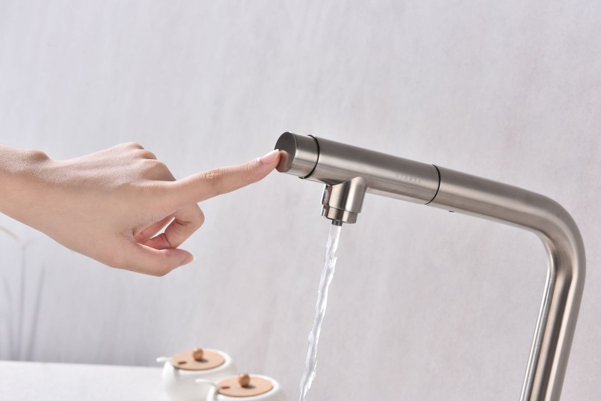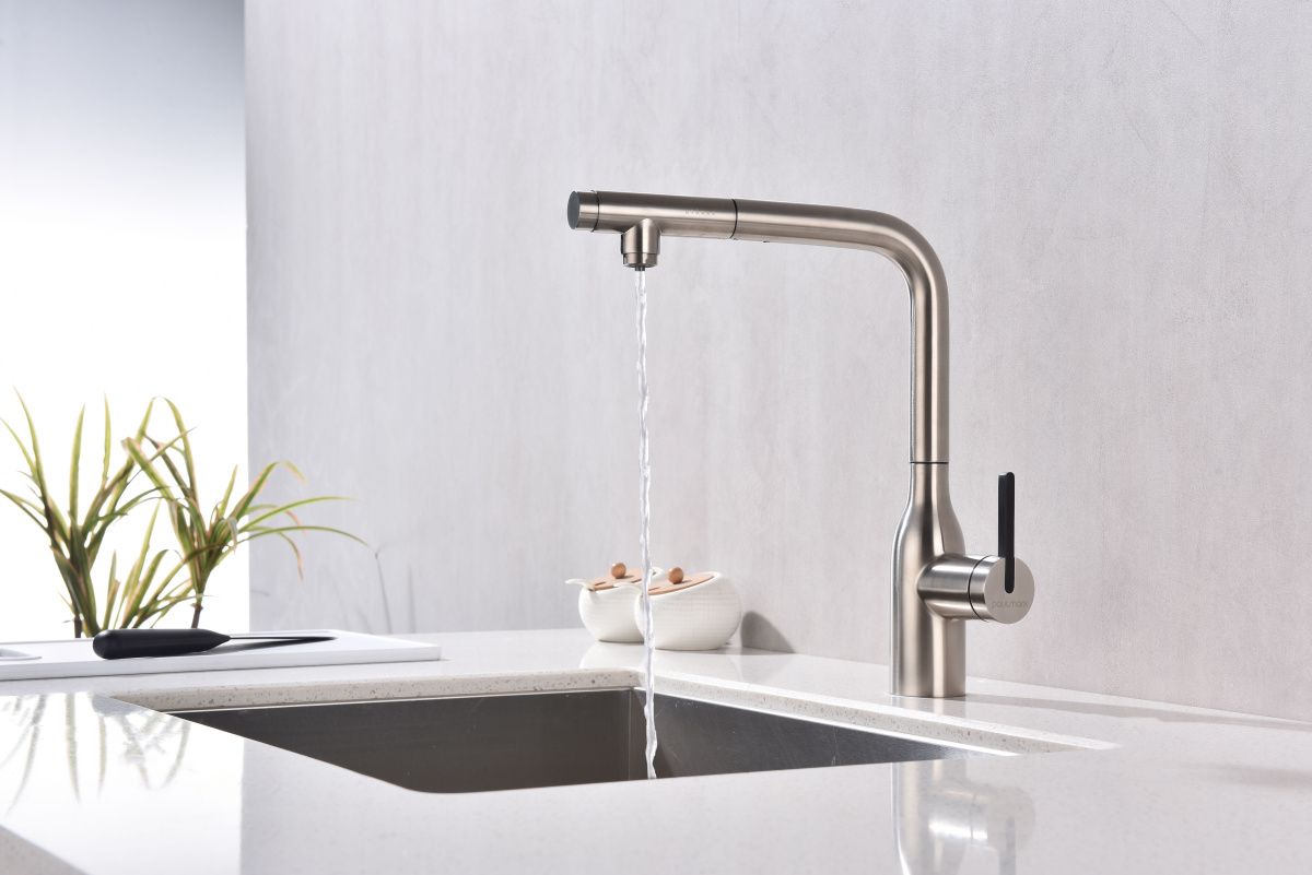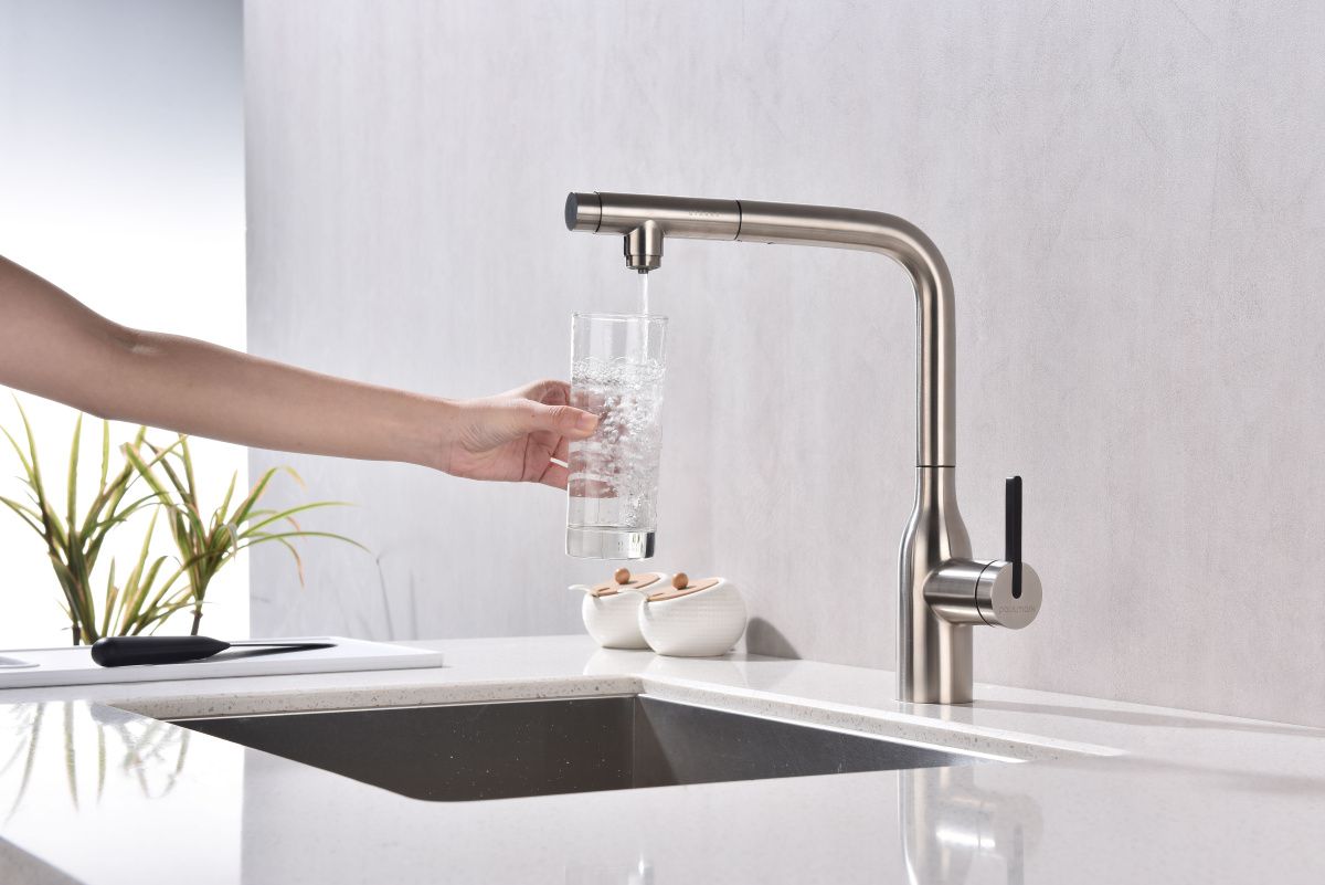 Смеситель VIPER имеет отдельный канал для питьевой воды. Переключение режимов осуществляется с помощью удобной и эргономично расположенной кнопки. Благодаря такому функционалу, потоки воды не смешиваются, а переключение осуществляется максимально комфортно.