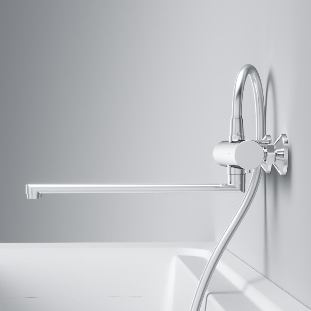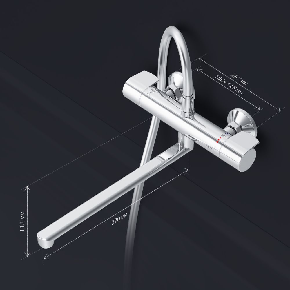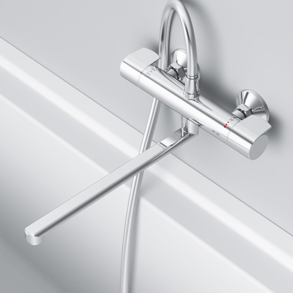 Длинный поворотный излив облегчит выполнение повседневных бытовых задач. Термостатический картридж с высокочувствительным термоэлементом и быстрой реакцией на изменения температуры или давления надежно защищает от ожога даже при внезапном отключении холодной воды.