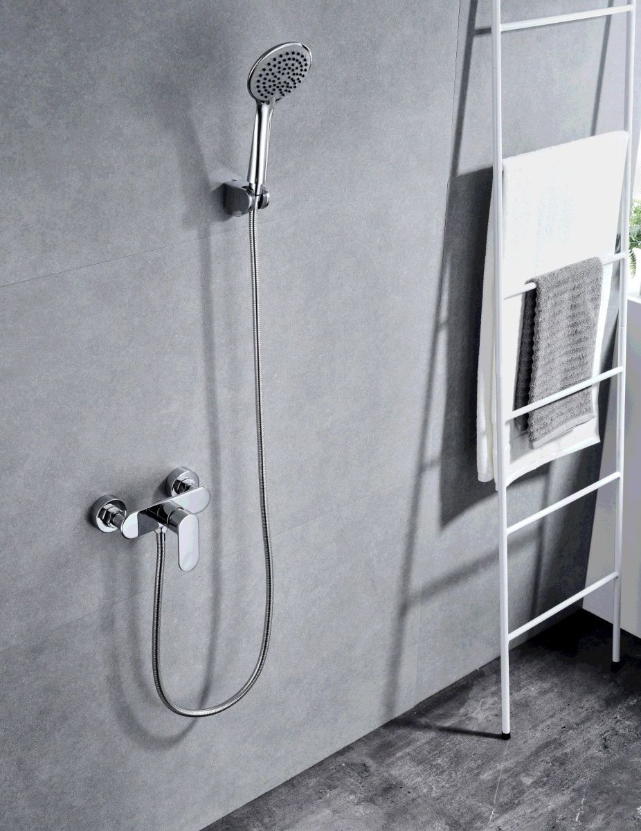 A2085 смеситель душевой с душевым гарнитуром хром латунь картридж D=35 мм установочный комплект + ручная лейка: артикул A012, ABS, D=125 мм, 3 режима, хром держатель настенный: ABS, хром шланг: артикул A40, оплётка сталь SUS201, 1500 мм, хром