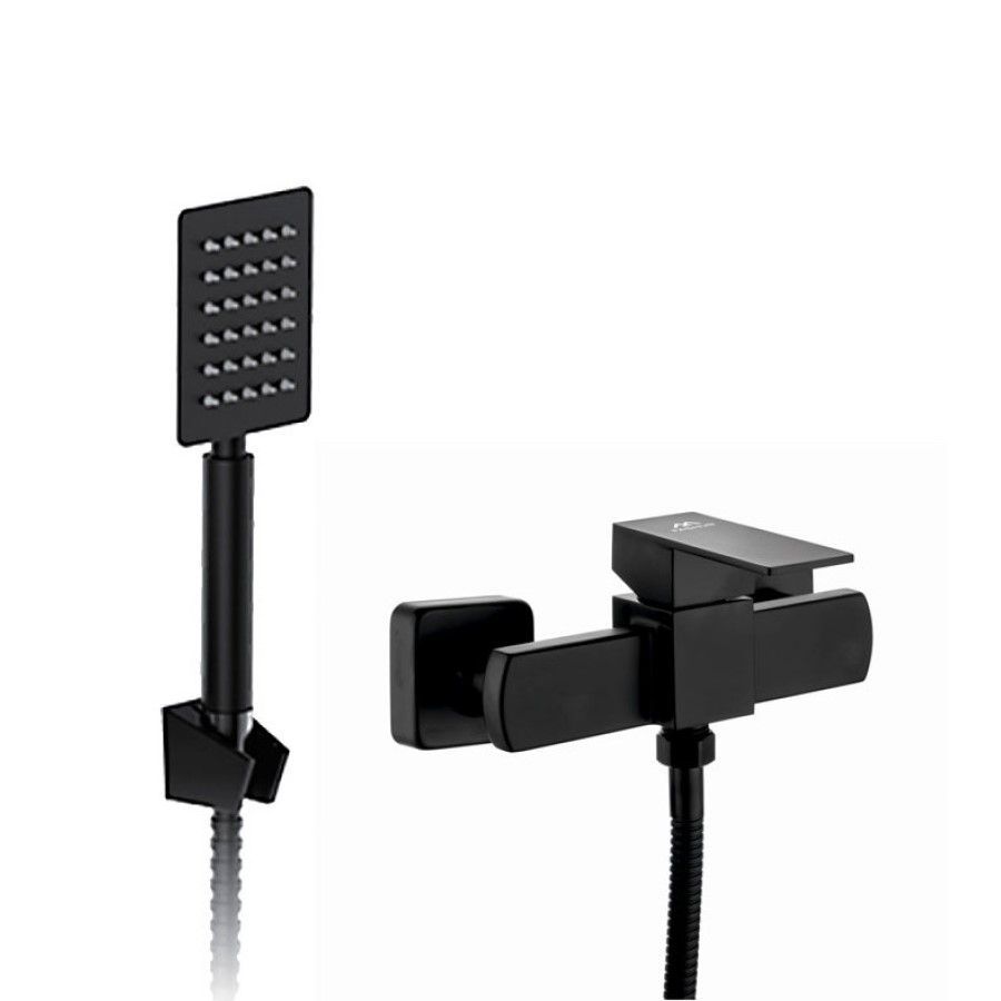 A52002-7 смеситель душевой с душевым гарнитуром чёрный сталь SUS304, картридж D=35 мм установочный комплект + ручная лейка: чёрная, сталь SUS304, 100х80 мм, 1 режим, антикальк держатель настенный: чёрный, сталь SUS304 шланг: чёрный, 1500 мм, оплётка сталь SUS304