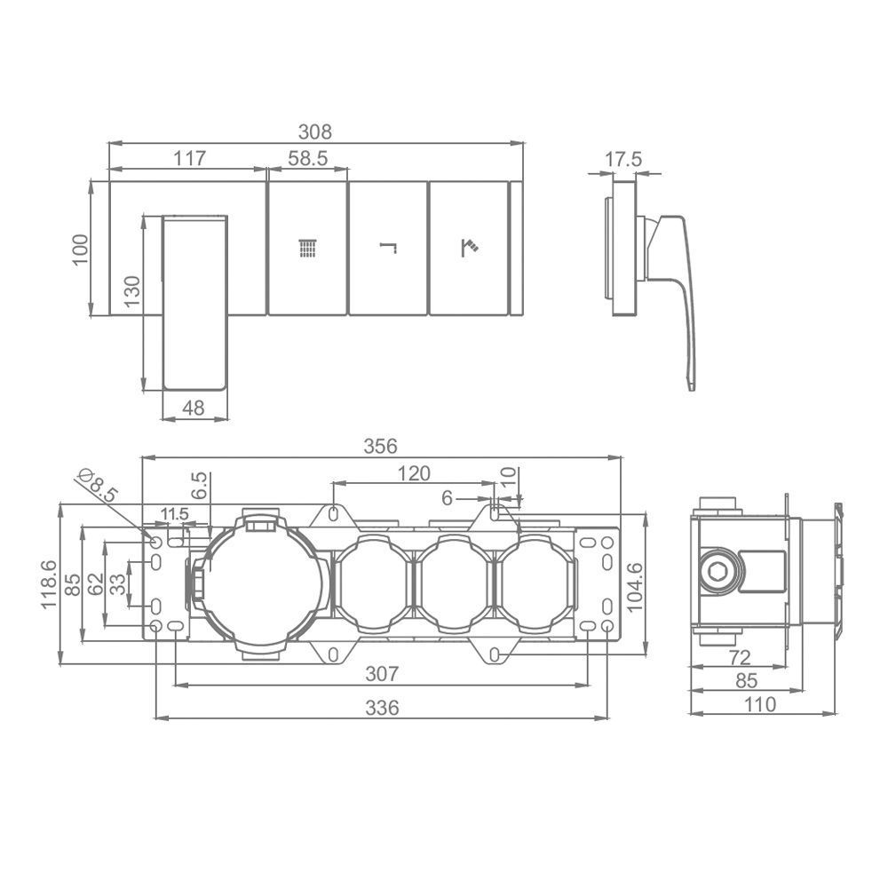 Корпус смесителя + внутренняя часть Raglo R02.273, 3-режима, хром. Встраиваемый монтаж. Керамический картридж 40 мм. Управление рычажное + кнопочное.
