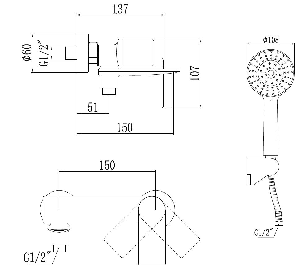 —Смеситель для ванны и душа Savol S-601808H настенный черный