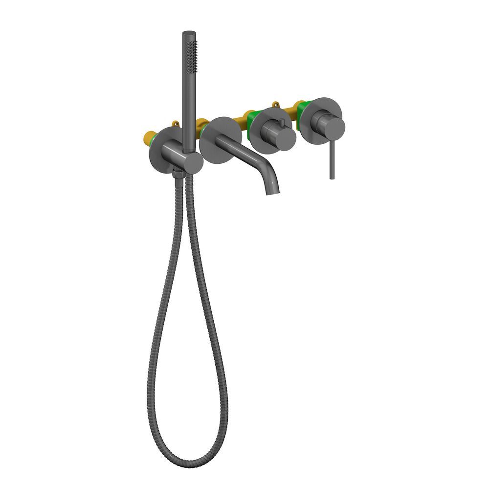 "Черное золото"- неизменно эффективный и привлекающий внимание цвет. Приглушенный мягкий оттенок черного, подчекнет форму раковины или цвет мебели. Встраиваемый смеситель Timo Saona 2314 предназначен для монтажа в твердой или полой стене. Уникальная дизайнерская модель с раздельными горизонтальными блоками, создаст неповторимый современный интерьер в ванной комнате. Основные преимущества встроенного смесителя: коммуникации, крепления и механизмы спрятаны в стену и видны только декоративные элементы, установить встроенный смеситель можно в любом месте. Стильная лейка-карандаш удобна в использовании и фиксируется в держателе с подключением душа. Регулировка температуры и напора воды осуществляется джойстиком справа. Переключение потока воды с излива на ручную лейку осуществляется поворотом ручки дивертора. Сложностей монтажа не возникает при установке смесителя опытным сантехником. Внимательно изучите инструкцию по монтажу и эксплуатации. Цвет "черное золото" не капризен в уходе, на нем менее заметны загрязнения и мелкие царапины.