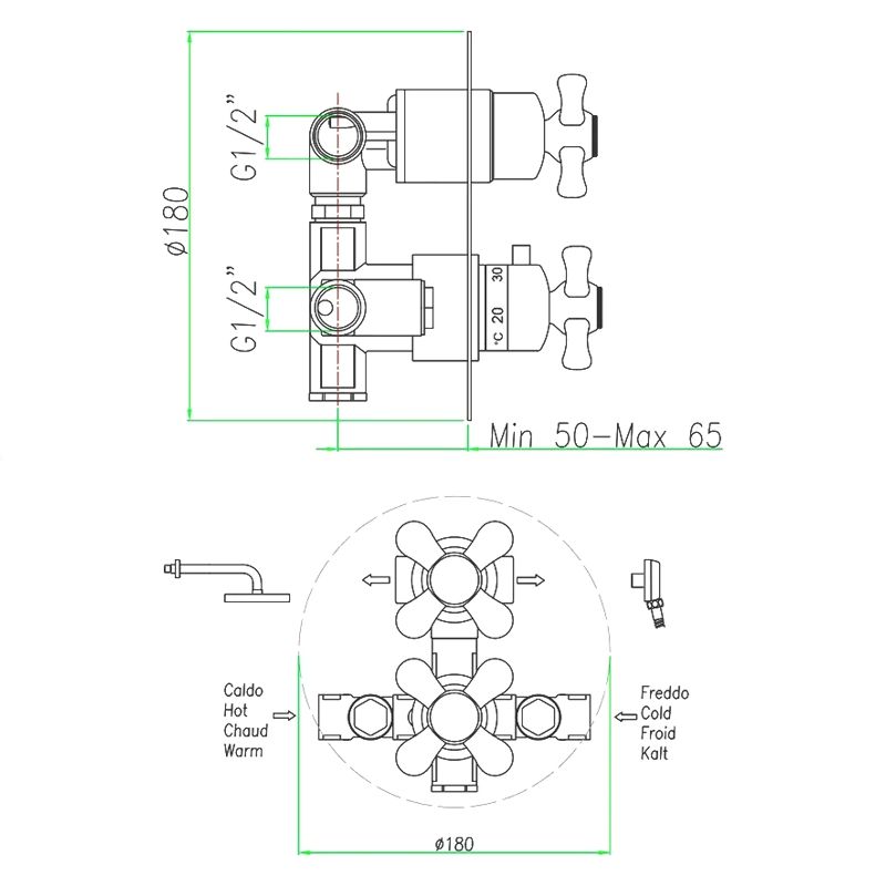 Смеситель для душа встраиваемый Webert Armony с термостатом, на 2 поток. Внутренняя часть в комплекте. Материал: латунь. Стиль ретро.