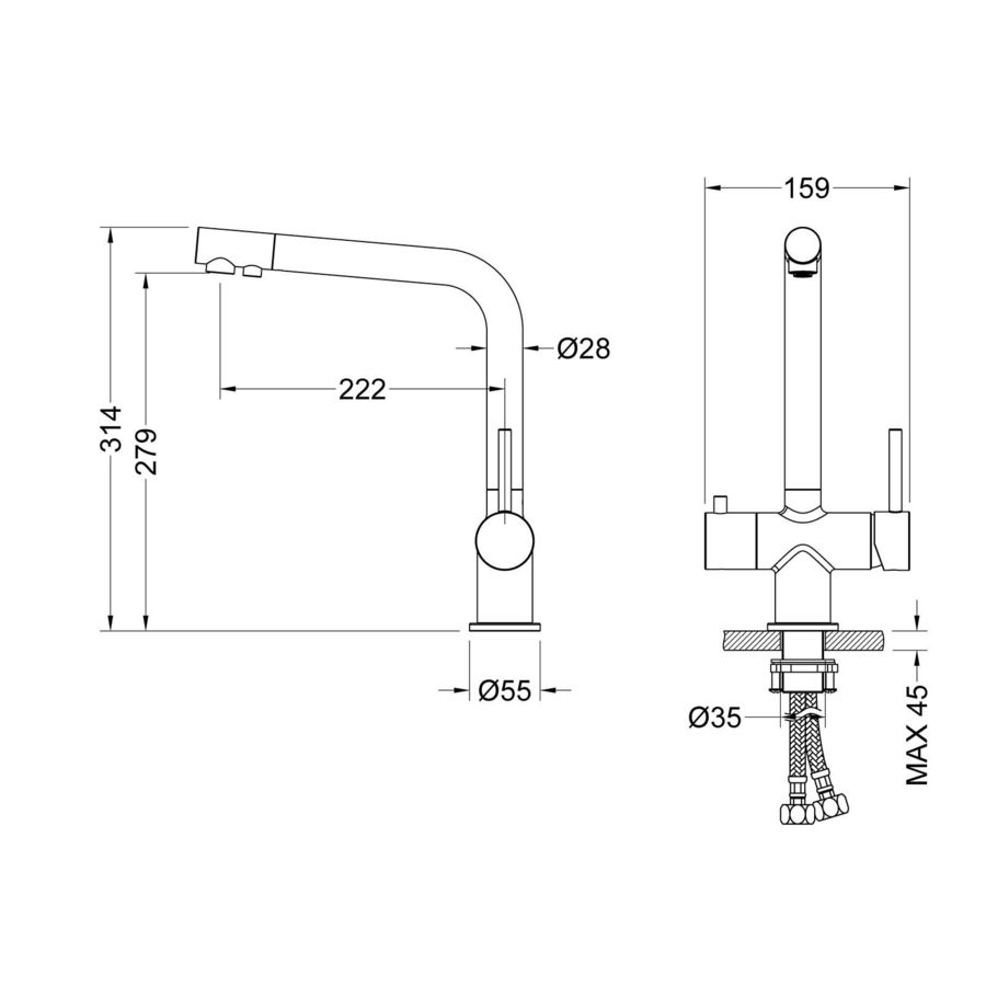 Цвет "матовое золото" никогда не выйдет из моды, во все времена драгоценный металл был признаком богатства.Смеситель Timo Saona 2396 с возможностью получения фильтрованной, минерализованной или газированной воды, относится к премиальному сегменту, предназначен для монтажа на кухонную мойку или столешницу. Основное преимущество смесителя - двухканальный картридж с функцией подключения к фильтру для воды и минерализатору или баллону с газом для получения газированной воды.  Высокий излив подходит для моек с двумя чашами, а также позволяет справляться с мытьем габаритной посуды. Удобное (вертикальное) расположение рычага смесителя в крайнем положении "холодный старт", позволяет не задевать ручкой за стеновые панели, фартук, предметы, которые находятся за смесителем. Картридж с функцией "холодный старт" работает в диапазоне 90 градусов, рычаг установленный в исходное положение (вертикально) при открытии подает только холодную воду, а не 50% холодной воды плюс 50% горячей, позволяя экономить до 30% расход горячей воды. В нижней части смесителя установлены 2 трубки с адаптером (можно подключиться к любой из них) для соединения с трубкой фильтра, минерализатора или баллона с газом. Подача фильтрованной воды осуществляется поворотом ручки дивертора, расположенной слева на корпусе смесителя (от себя или на себя) в зависимости от того какую из трубок вы выбрали для подключения с трубкой фильтра. Вставьте заглушку (входит в комплект) до упора в свободную трубку, если она не ипользуется. Положение 12-00 дивертор выключен. Сложностей монтажа не возникает при установке смесителя опытным сантехником. Внимательно изучите инструкцию по монтажу и эксплуатации.