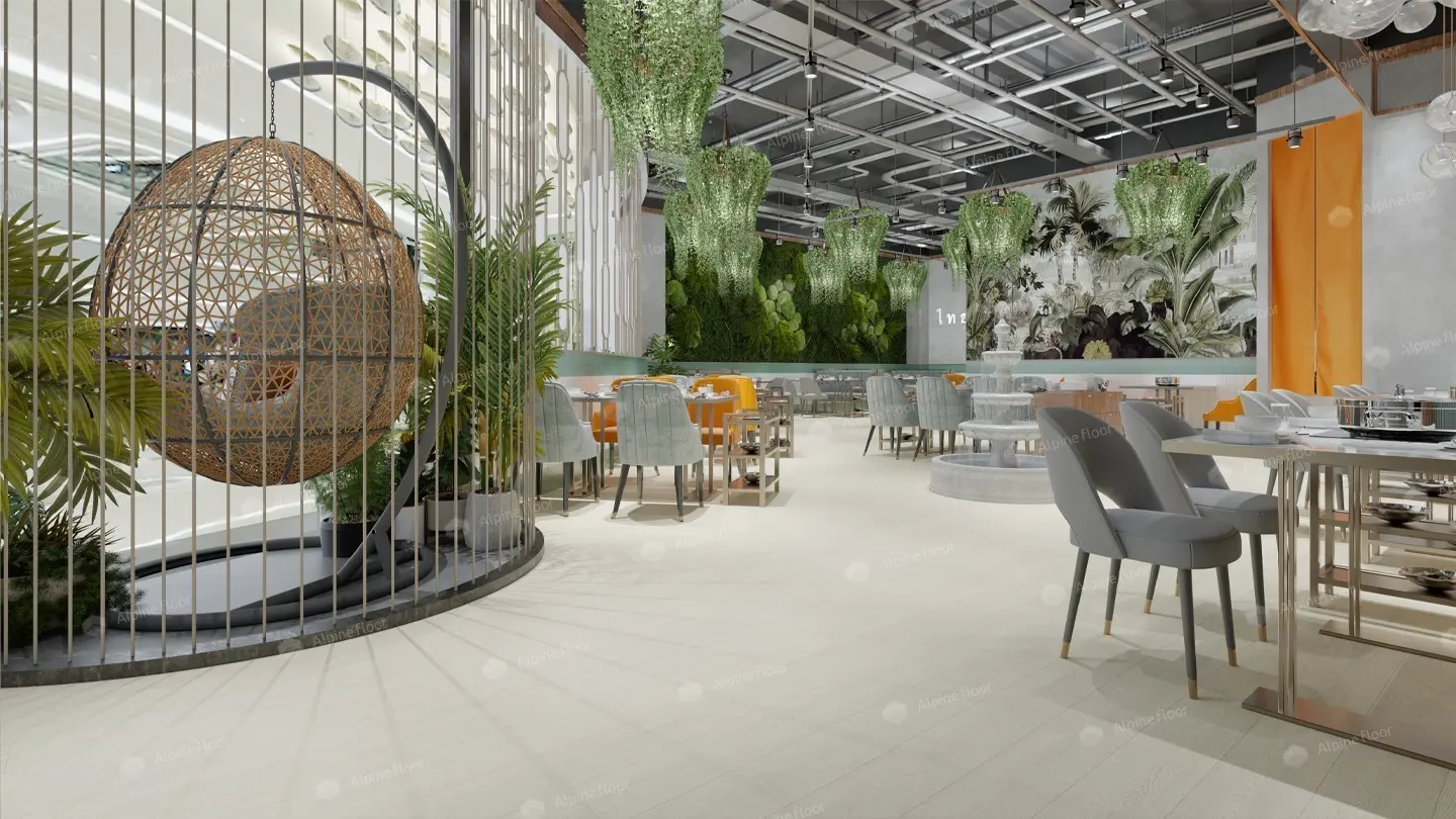 Напольный декор на фото смотрится потрясающе. Светлый пол выглядит невECOмо, аккуратно и лаконично. При этом он невероятно прочный, о чем говорит 43 класс износостойкости. Каменно-полимерное покрытие еще и водостойкое. Оно не деформируется даже при постоянном контакте с водой, как это бывает в ванных комнатах. ПВХ плитка универсальна: подходит для дома, коммерческих площадей и общественных мест. Она соответствует нормам безопасности: сделана из негорючих материалов, экологически безопасна, не скользит.