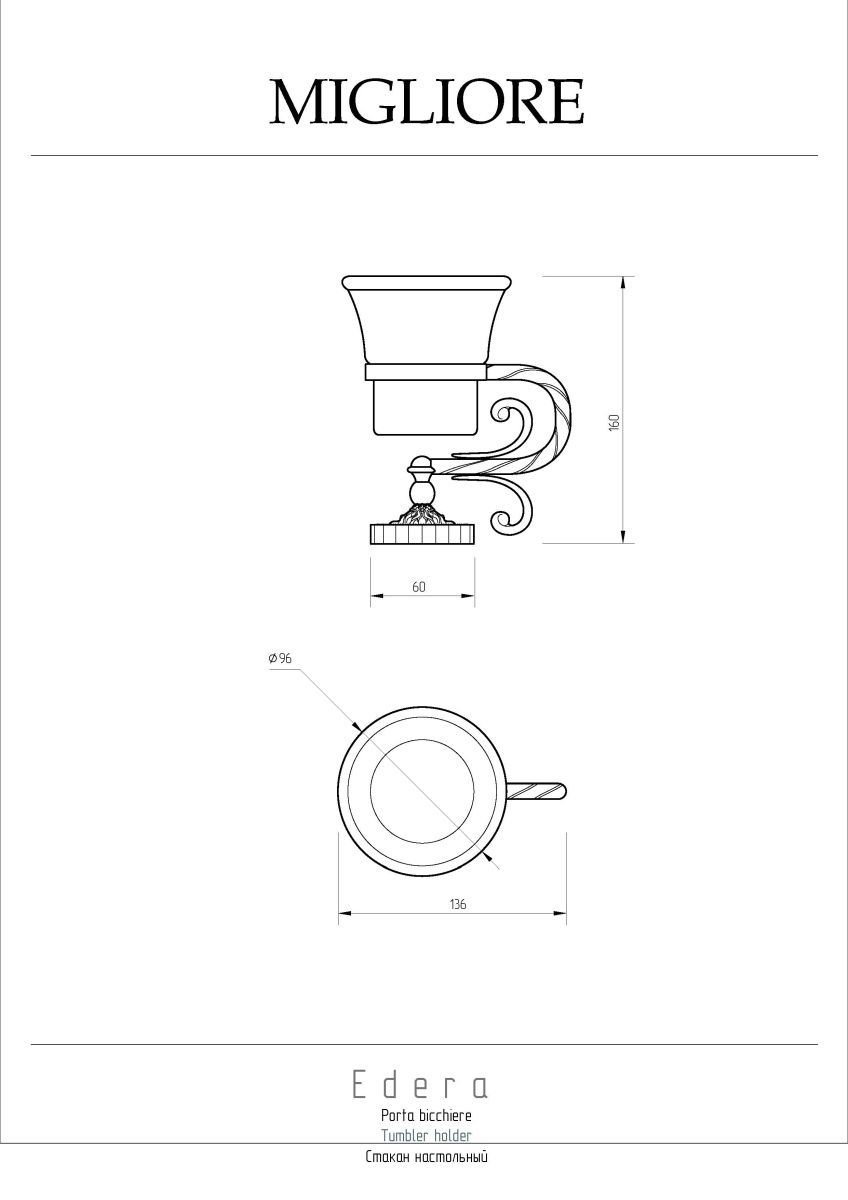 Стакан настольный коллекции EDERA бренда MIGLIORE - один из самых необходимых аксессуаров для ванной комнаты. Стакан выполнен в классическом стиле и предназначен для хранения зубных щеток и тюбиков с пастой. Благодаря витым элементам и необычной овальной розетке аксессуары коллекции EDERA будут смотреться элегантно и оригинально в классическом интерьере ванной комнаты.