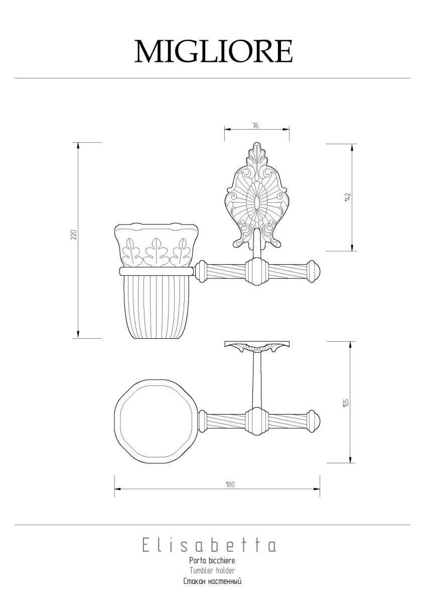 Стакан настенный коллекции ELISABETTA бренда MIGLIORE — один из самых необходимых аксессуаров для ванной комнаты. Стакан выполнен в  классическом стиле и предназначен для хранения зубных щеток и тюбиков с пастой. Между керамикой и латунным кольцом имеется уплотнительное пластиковое кольцо, которое надежно удерживает колбу стакана. Розетка аксессуара имеет необычную форму, и удобный крепеж.