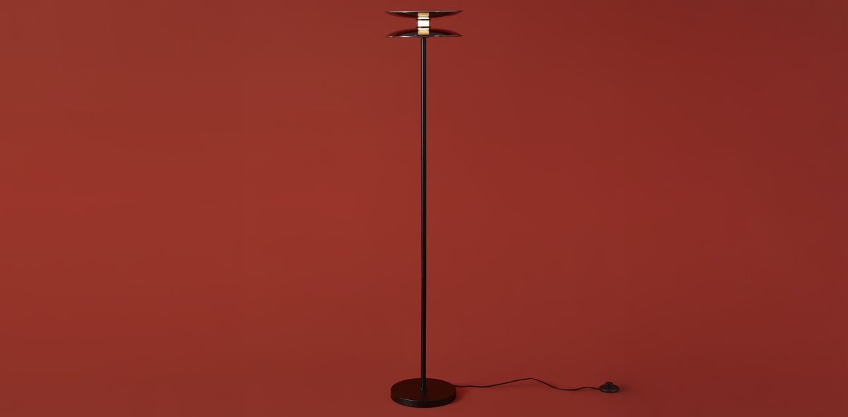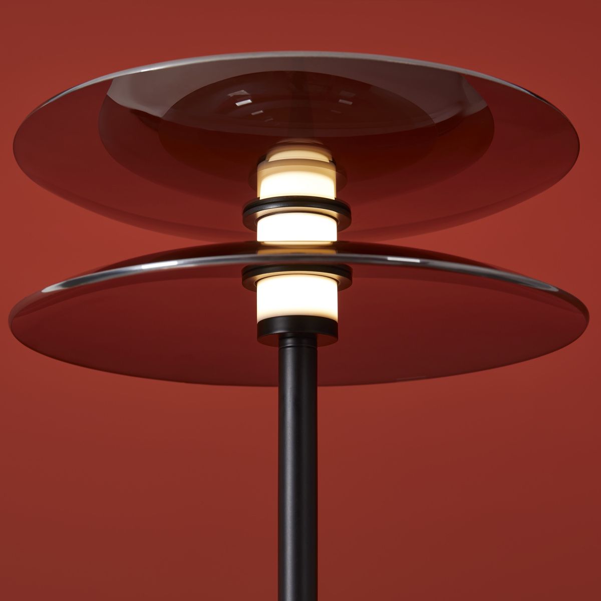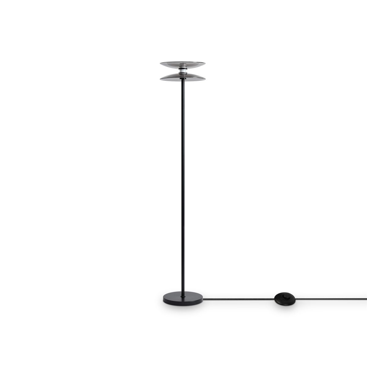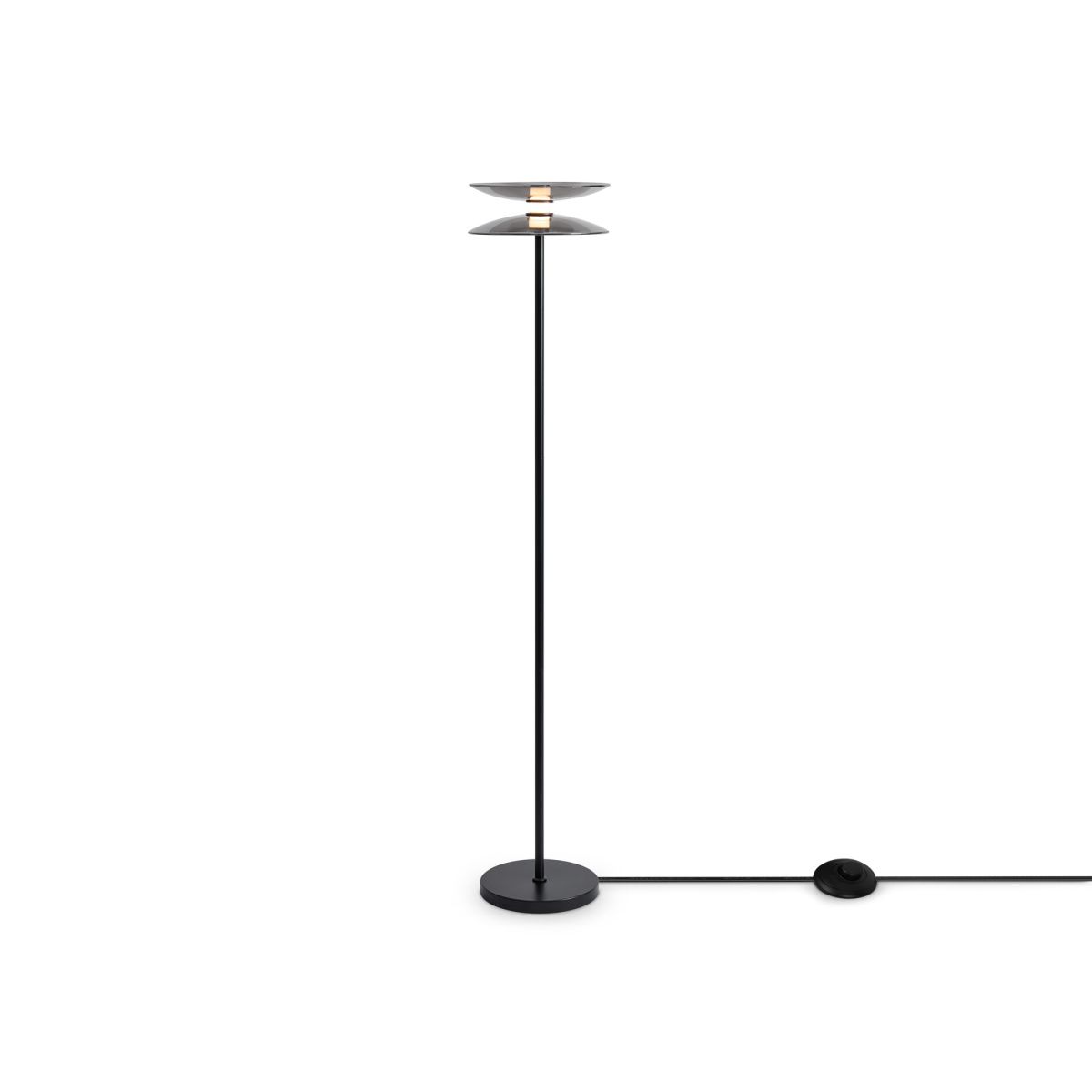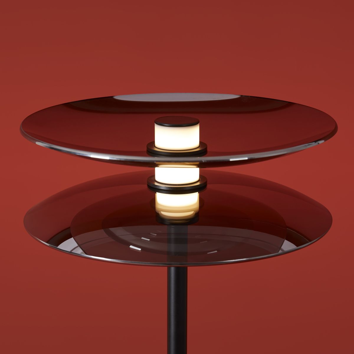 Материал арматуры — металл, цвет — черный. Плафоны выполнены из стекла дымчатого цвета. Светильники представлены в подвесном и напольном исполнении и оснащены LED-источником света с цветовой температурой 3000К.  Сочетание металла и затемненного стекла создает выразительную атмосферу в современных интерьерах таких как минимализм и лофт.