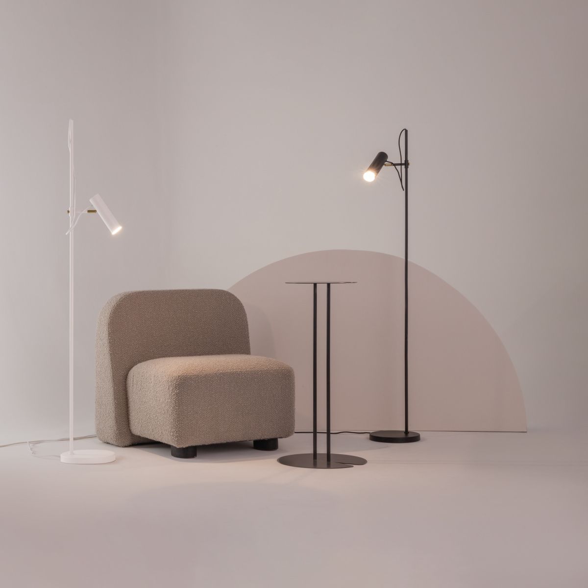 Металлическая арматура, оттенки – черный, белый. Плафон-цилиндр из металла в тон арматуре. Минималистичный дизайн