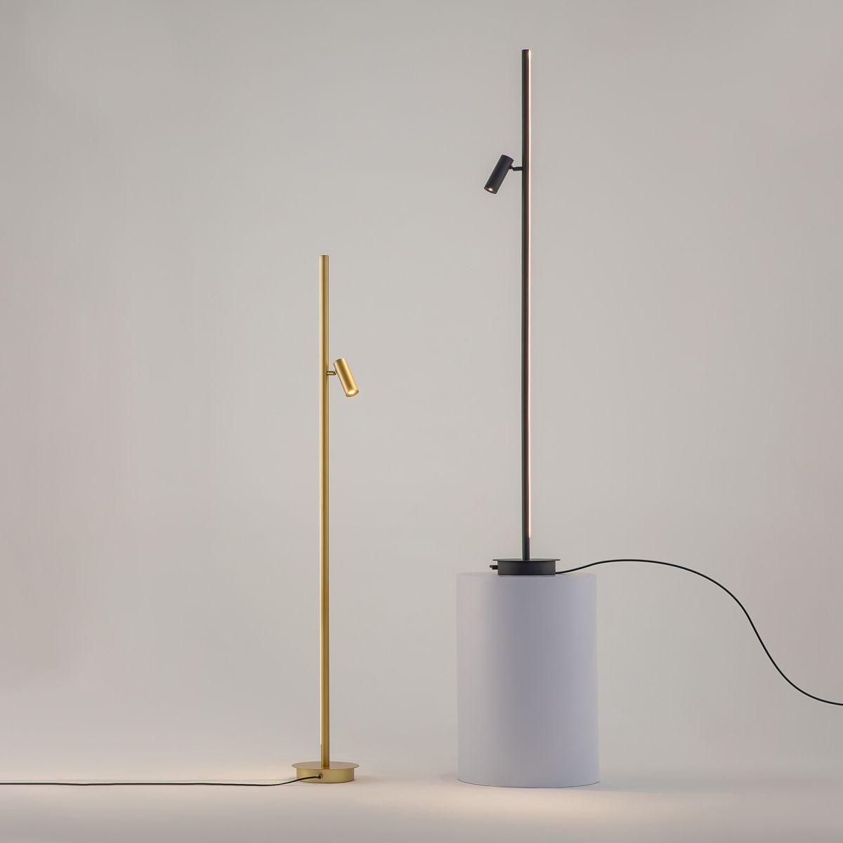 Функциональные напольные торшеры. Цвет арматуры — черный, латунный. Материал арматуры — алюминий. Два типа освещения: переотраженный, направленный. Поворотный спот для направления света на нужную зону. LED-источник света. Серия торшеров для создания многогранных световых сценариев. Особенно эффектно смотрится в интерьерах с фактурными стенами.