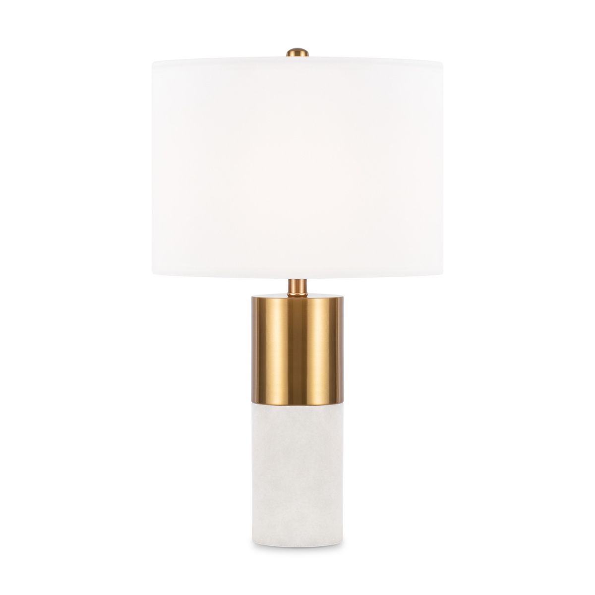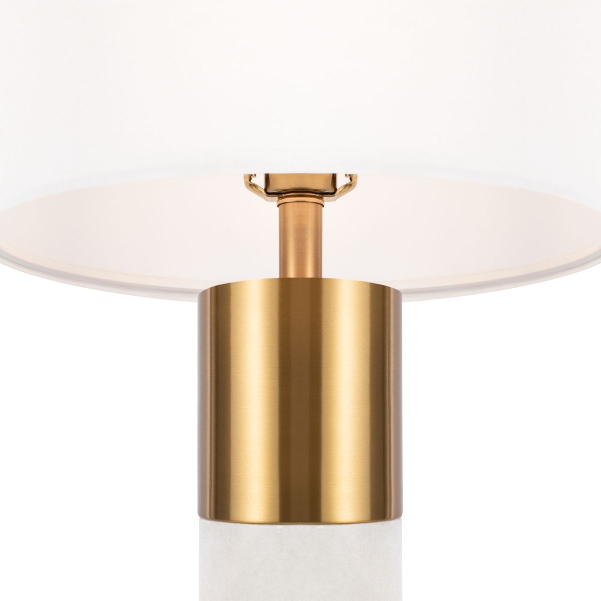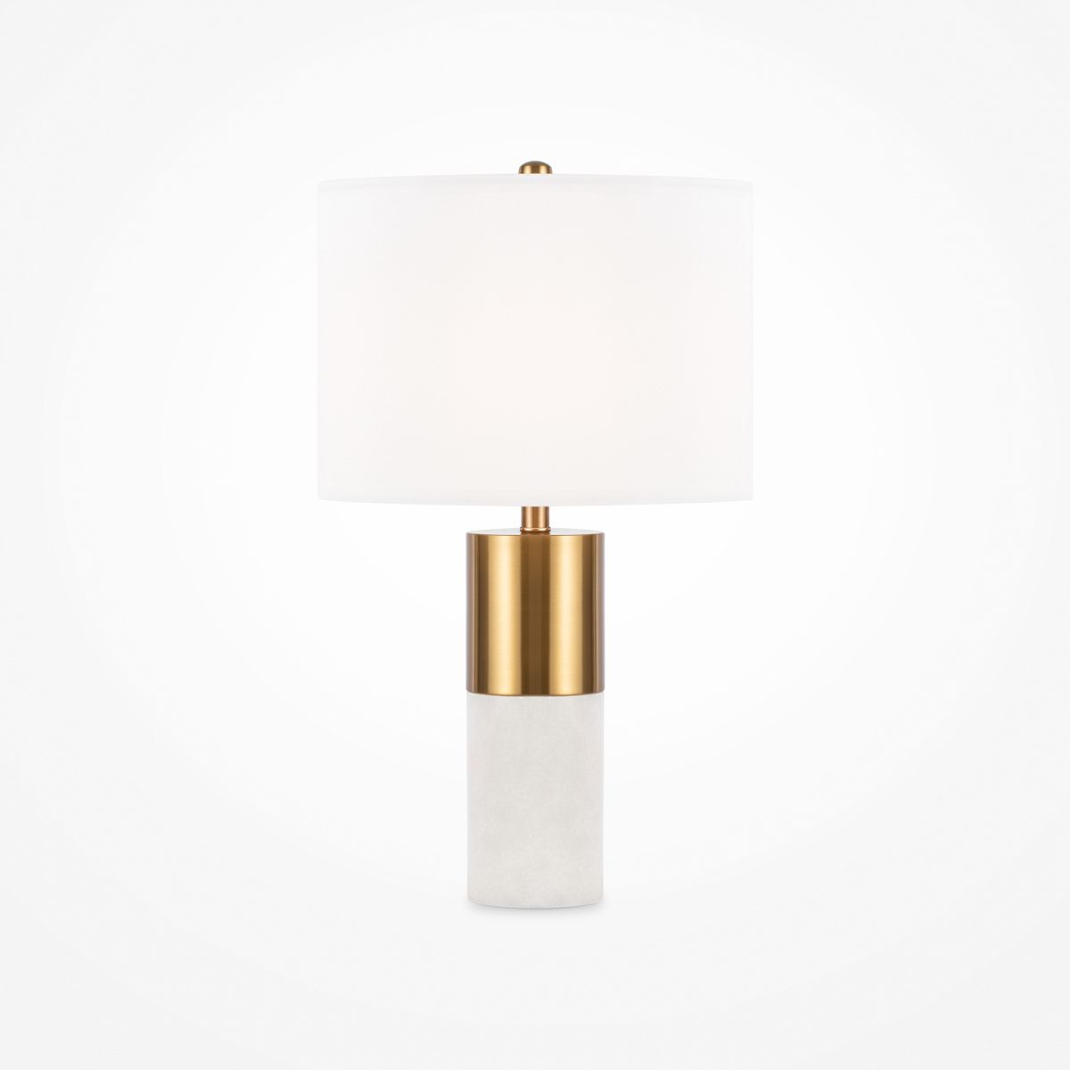 Металлическая арматура, цвет – латунь. Абажур – белый хлопок. Изюминка дизайна – элементы из натурального камня (алебастра). Трендовый микс фактур. Лаконичные формы в американском стиле. Источник света - лампа с цоколем Е14.