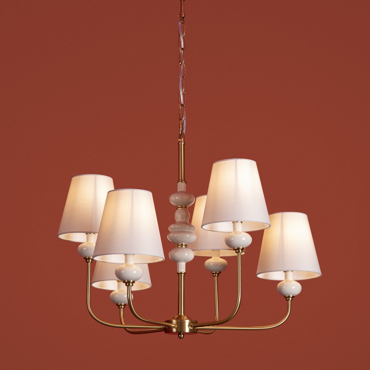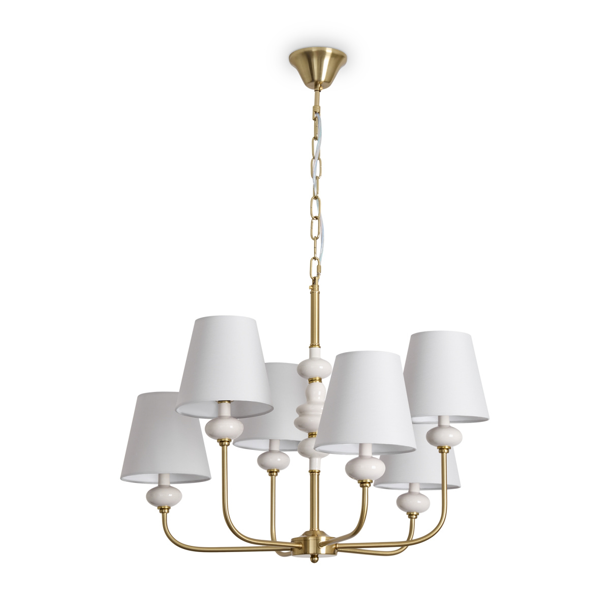 Материал арматуры — металл, цвет — латунь. Подвесные светильники с цоколем E14. Светильники с керамическими декоративными элементами серо бежевых оттенков. Белый абажур, выполнен из натуральной ткани. Сочетание классической элегантности с современным дизайном создает утонченную атмосферу в интерьере.