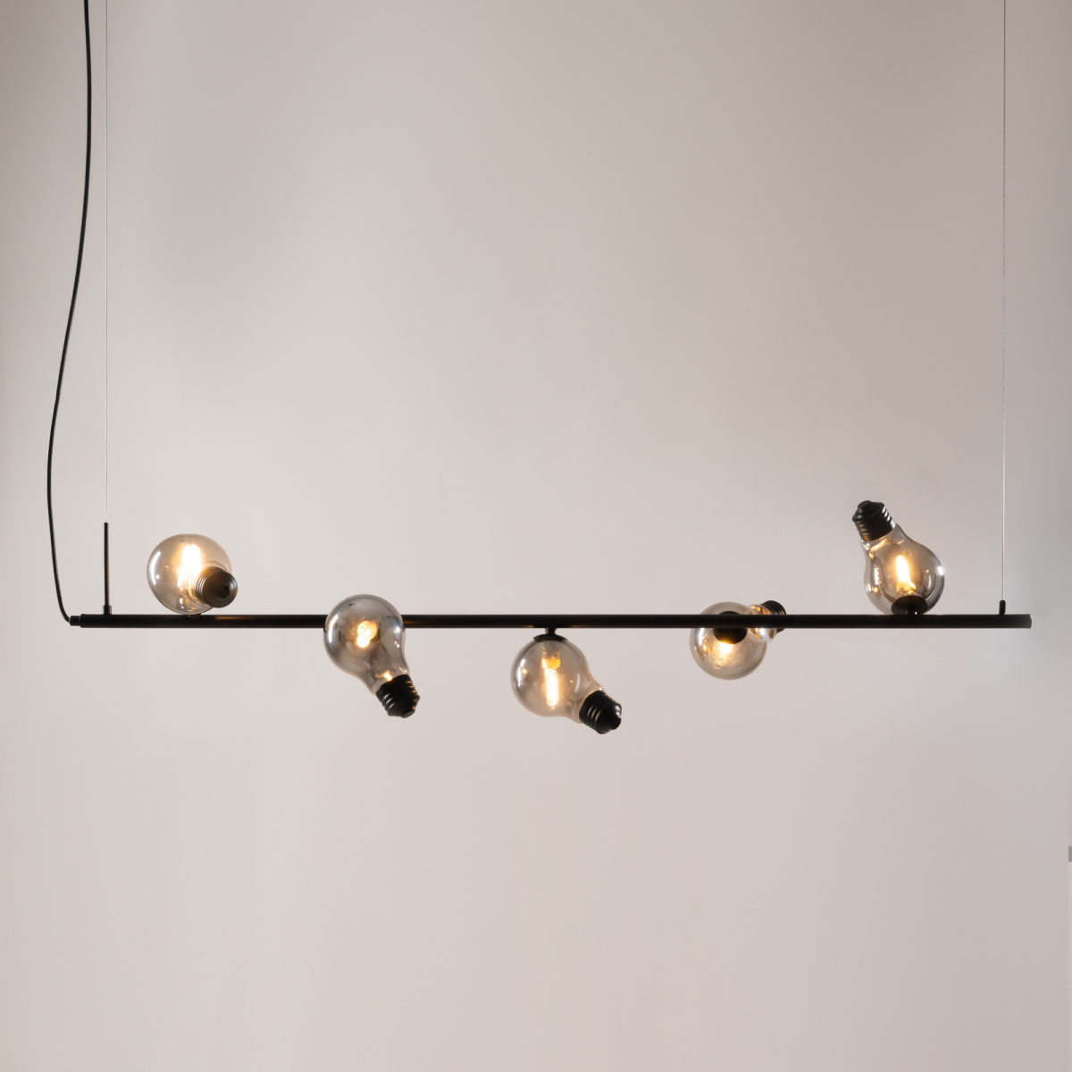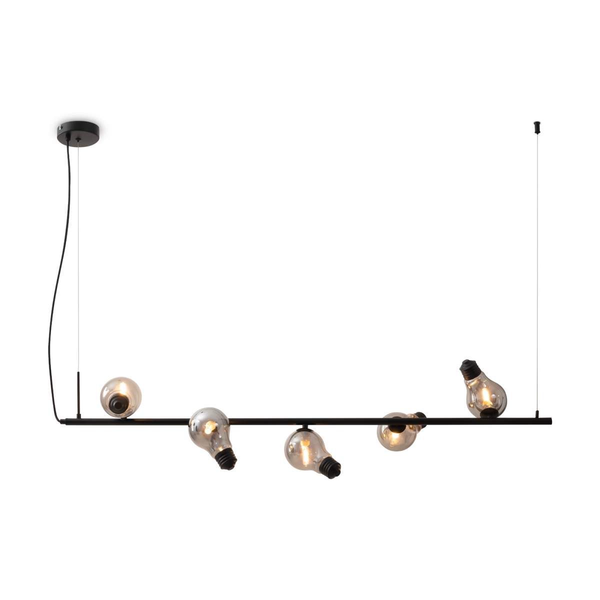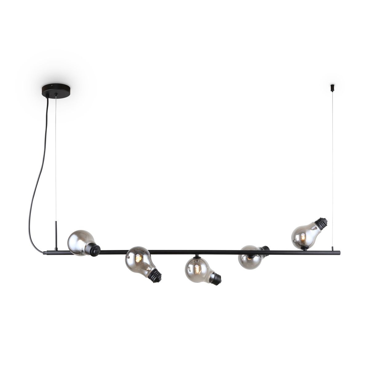 Металлическая арматура, цвета — чёрный и латунь. Прозрачные плафоны-лампочки из стекла в тон арматуры хаотично “разбросаны” по острову светильника. Подвесы регулируются по высоте. Источник света — лампа с цоколем G9.