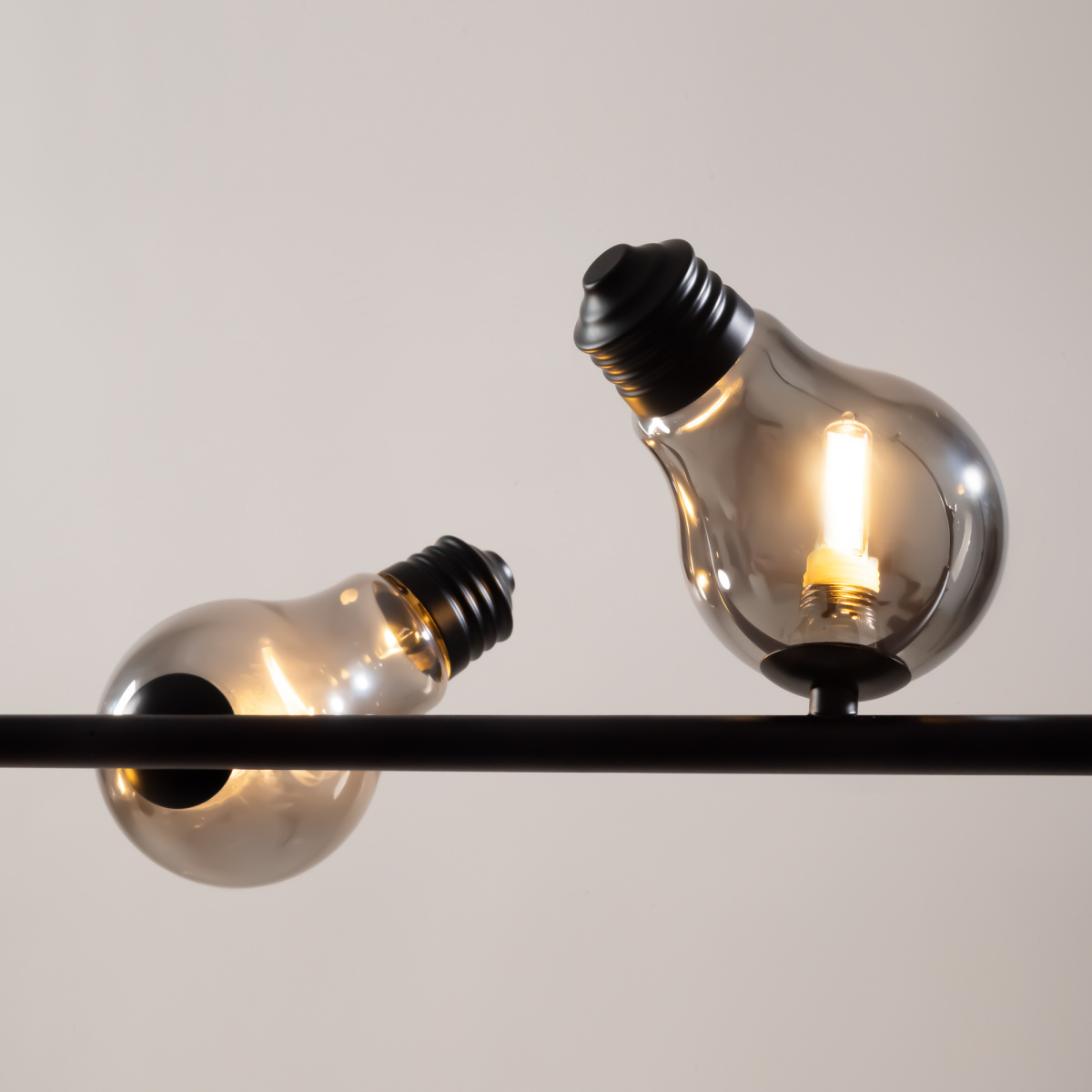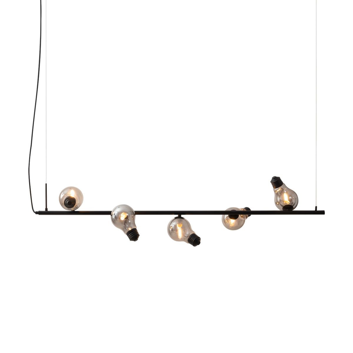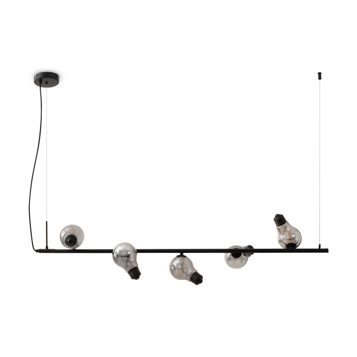 Металлическая арматура, цвета — чёрный и латунь. Прозрачные плафоны-лампочки из стекла в тон арматуры хаотично “разбросаны” по острову светильника. Подвесы регулируются по высоте. Источник света — лампа с цоколем G9.