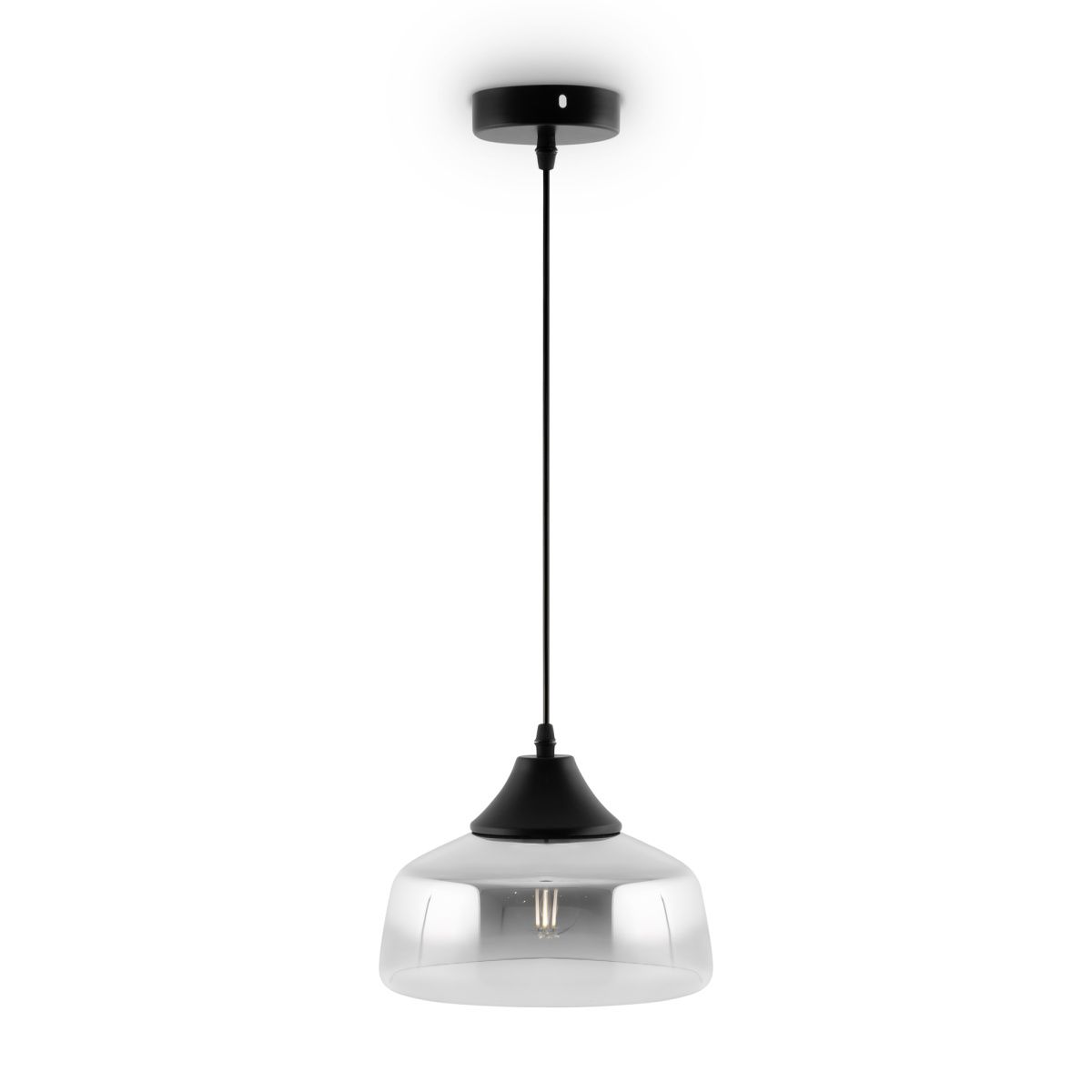 Металлическая арматура в черном цвете. Стеклянный плафон с мягким градиентным переходом оттенков. Цветовые решения – серый, янтарный. Трендовая обтекаемая форма. Источник света – лампа с цоколем E27.