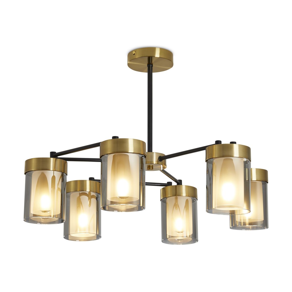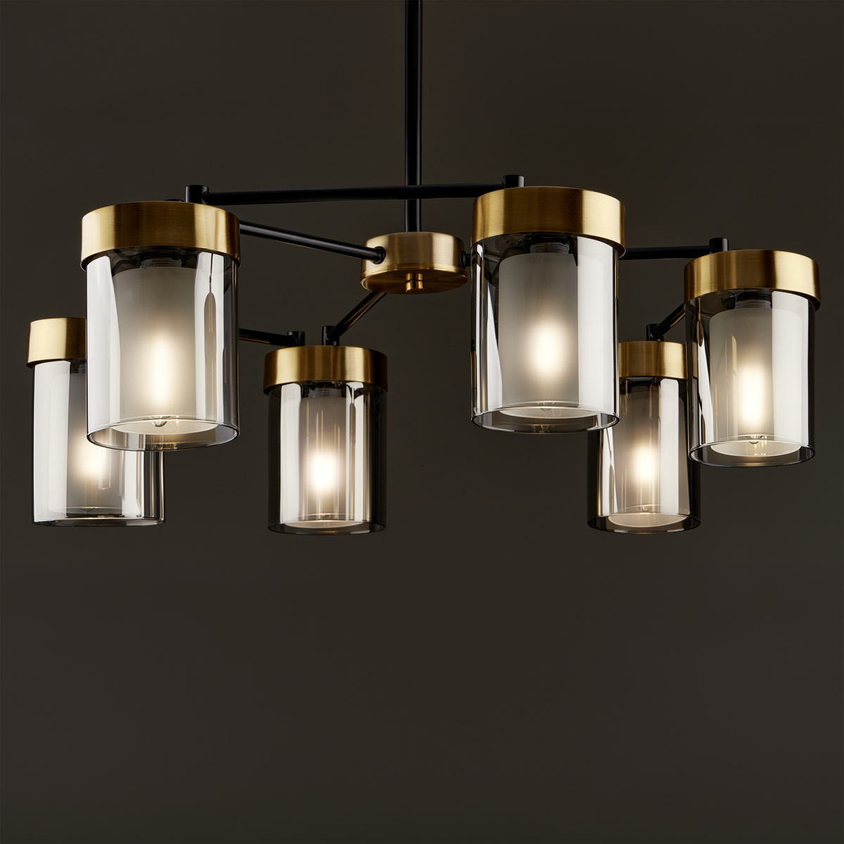 Арматура - металл в двух востребованных оттенках латунь и черный. Плафоны из двойного стекла дымчатого оттенка, внутри белый матовый. Трендовая форма плафонов в виде цилиндра. Потолочные светильники подойдут для помещений с низкими потолками. Источник света лампа. Цоколь E14