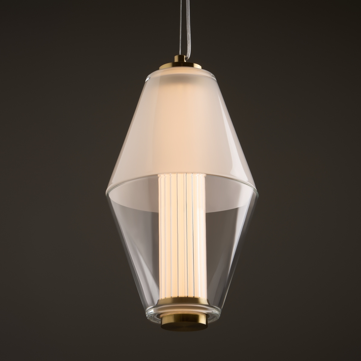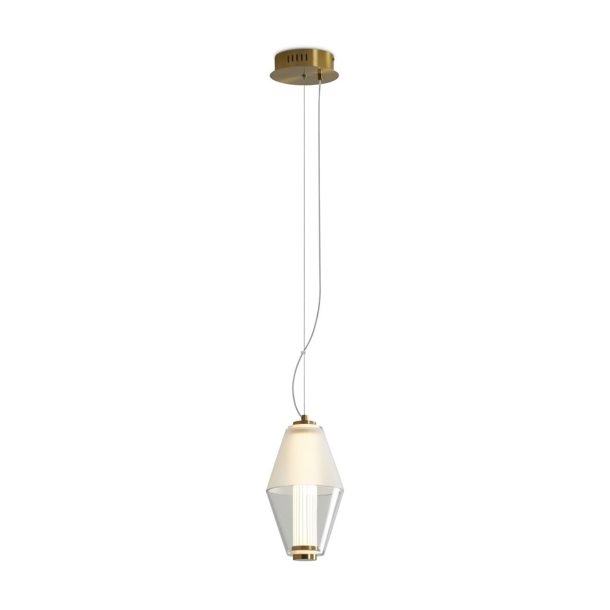 Арматура из металла. Цвет латунь. Плафон из матового, кристально прозрачного и дымчатого стекла. Горизонтальные и вертикальные подвесы. LED источник света. Цветовая температура 3000К.