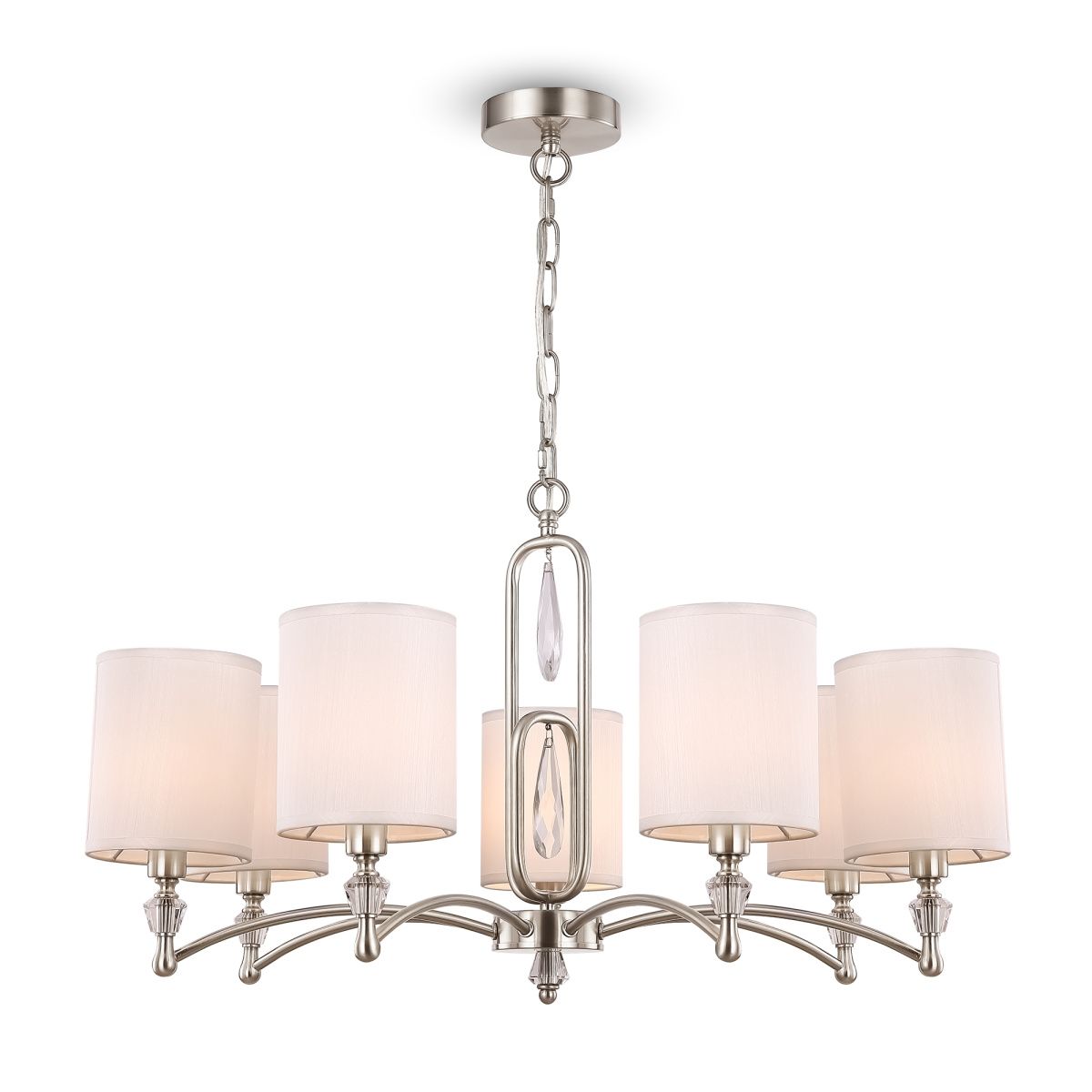 Материал арматуры – нержавеющая сталь, цвет – хром. Материал абажуров – текстиль на ПВХ, цвет – белый. Декор – прозрачное стекло. Акцентные стеклянные кристаллы на рожках со сложной огранкой.