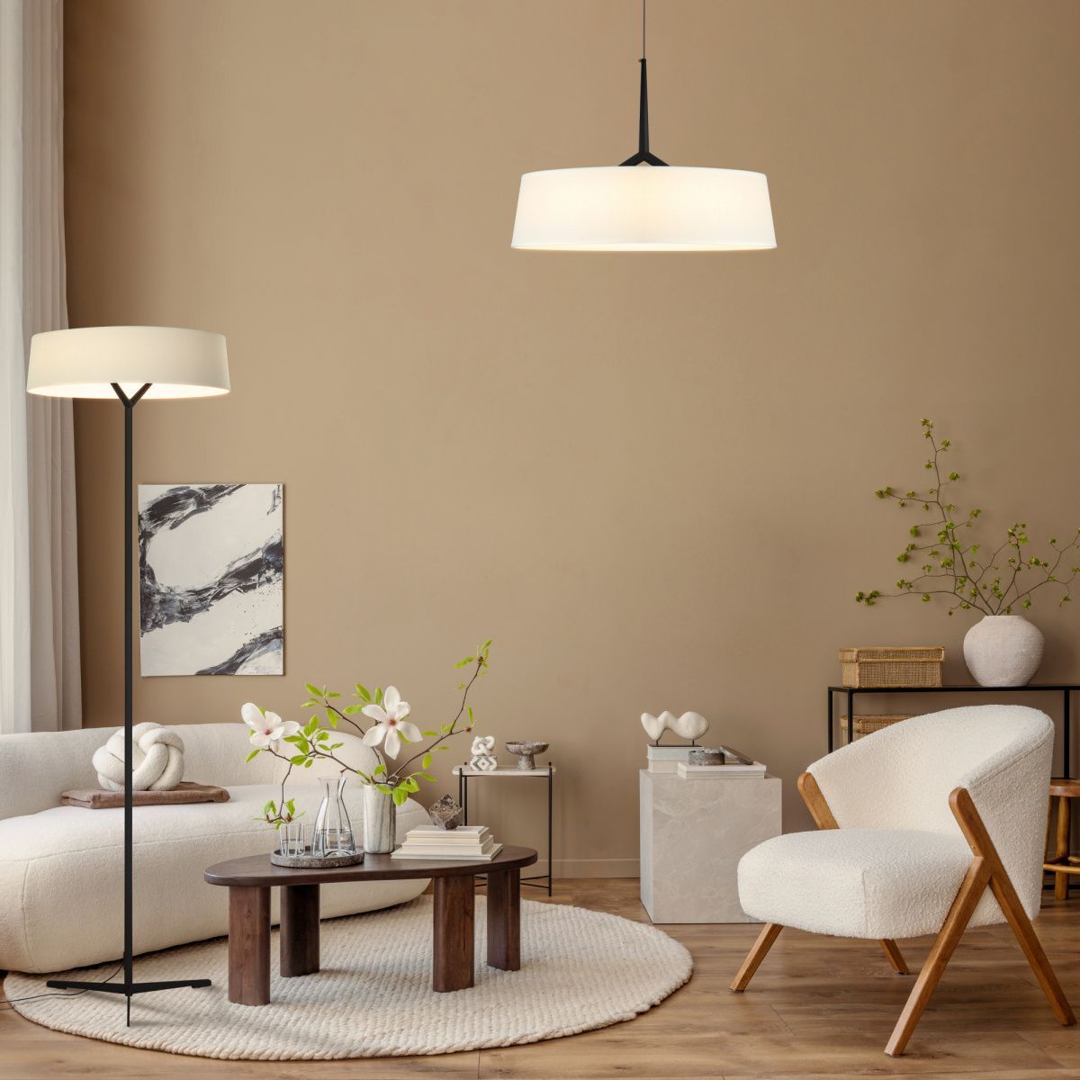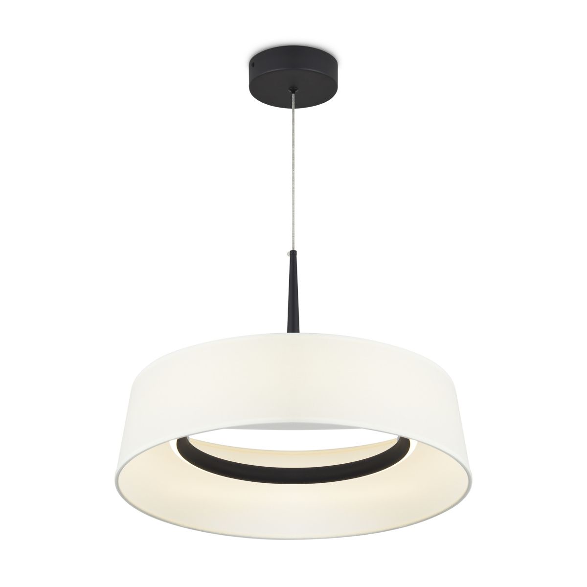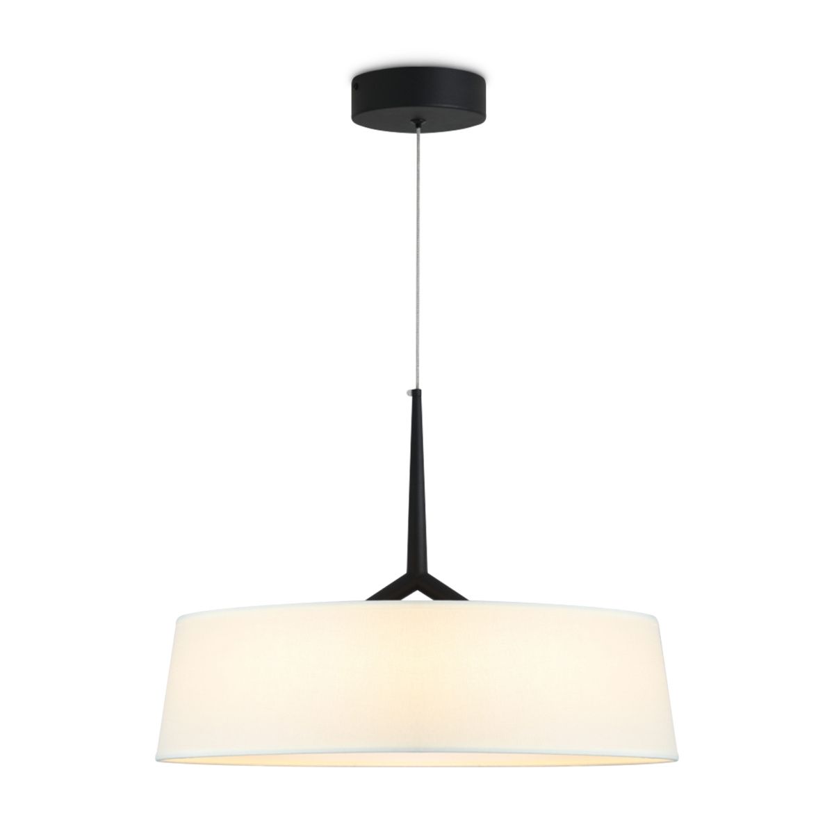Арматура - металл. Цвет - черный. LED-источник света округлой формы спрятанный под тонкой юбкой абажура из ткани теплого белого оттенка. Серия создана на основе популярной серии Vabi. Цветовая температура 3000К.