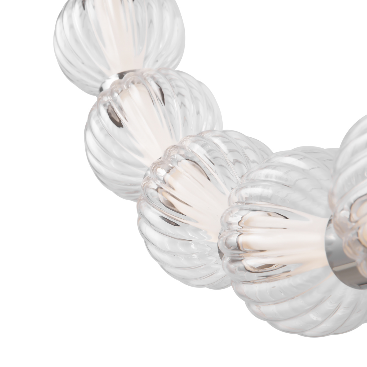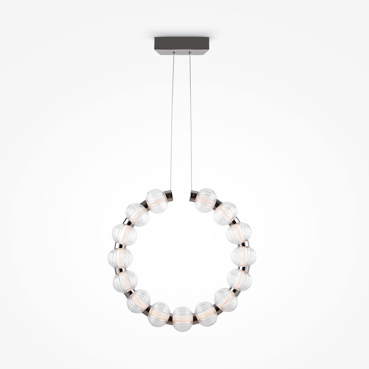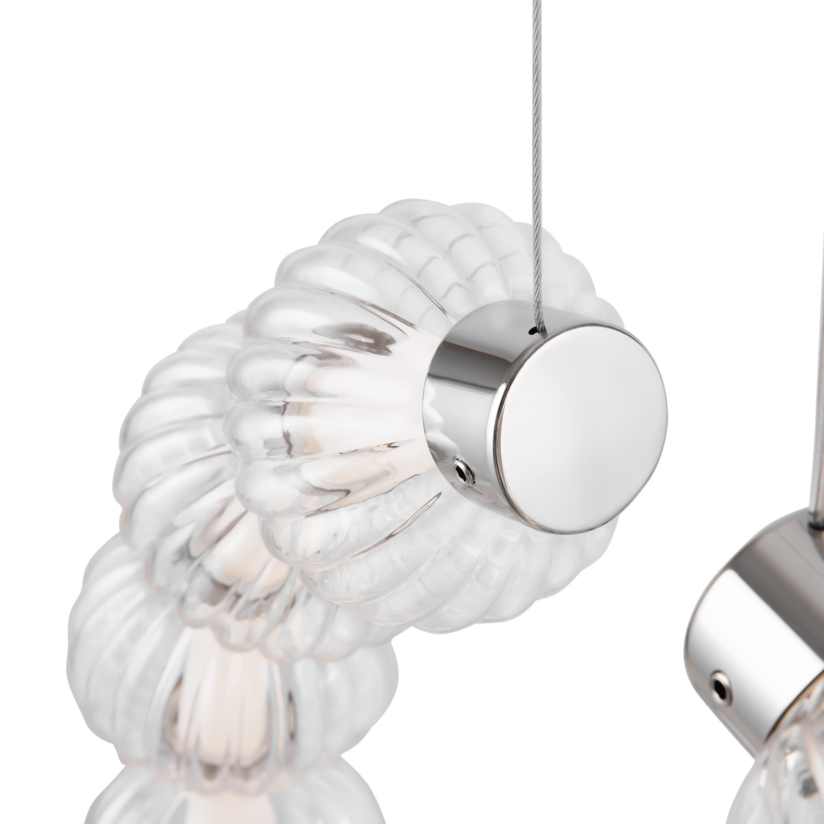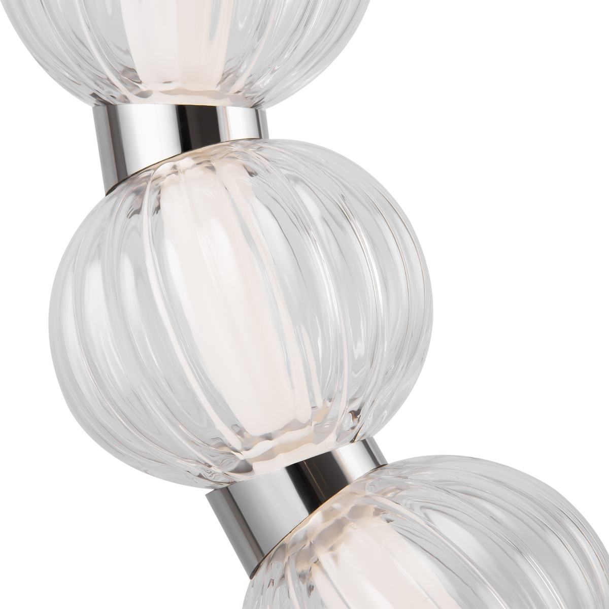 Арматура из металла, цвет – хром. Акцентный декор в виде рельефных сфер из литого стекла. Источник света – светодиодная лента – скрыта под акриловым рассеивателем. Регулируемая высота подвесных светильников.
