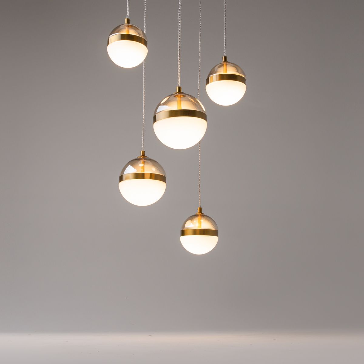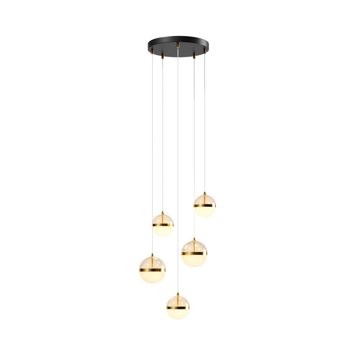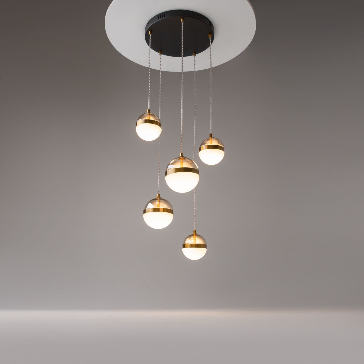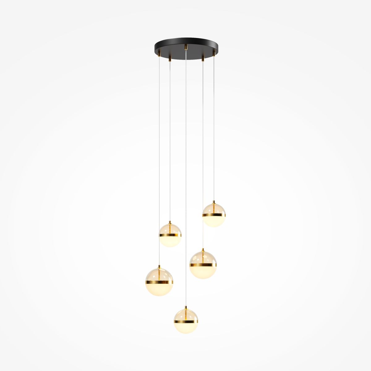 Черная потолочная чаша дополнена финишным антибликовым покрытием sandy, декоративный элемент плафона выполнен из металла цвета сатинированной латуни. Сочетание двух фактурных стекол в плафоне: нижняя полусфера из матового белого стекла для создания мягкого рассеянного  света, верхняя часть плафона - из тонированного янтарного стекла. Внутри установлен LED-модуль, создающий равномерное освещение, направленное вверх и вниз. Цветовая температура – 3000К, угол рассеивания — 120°.