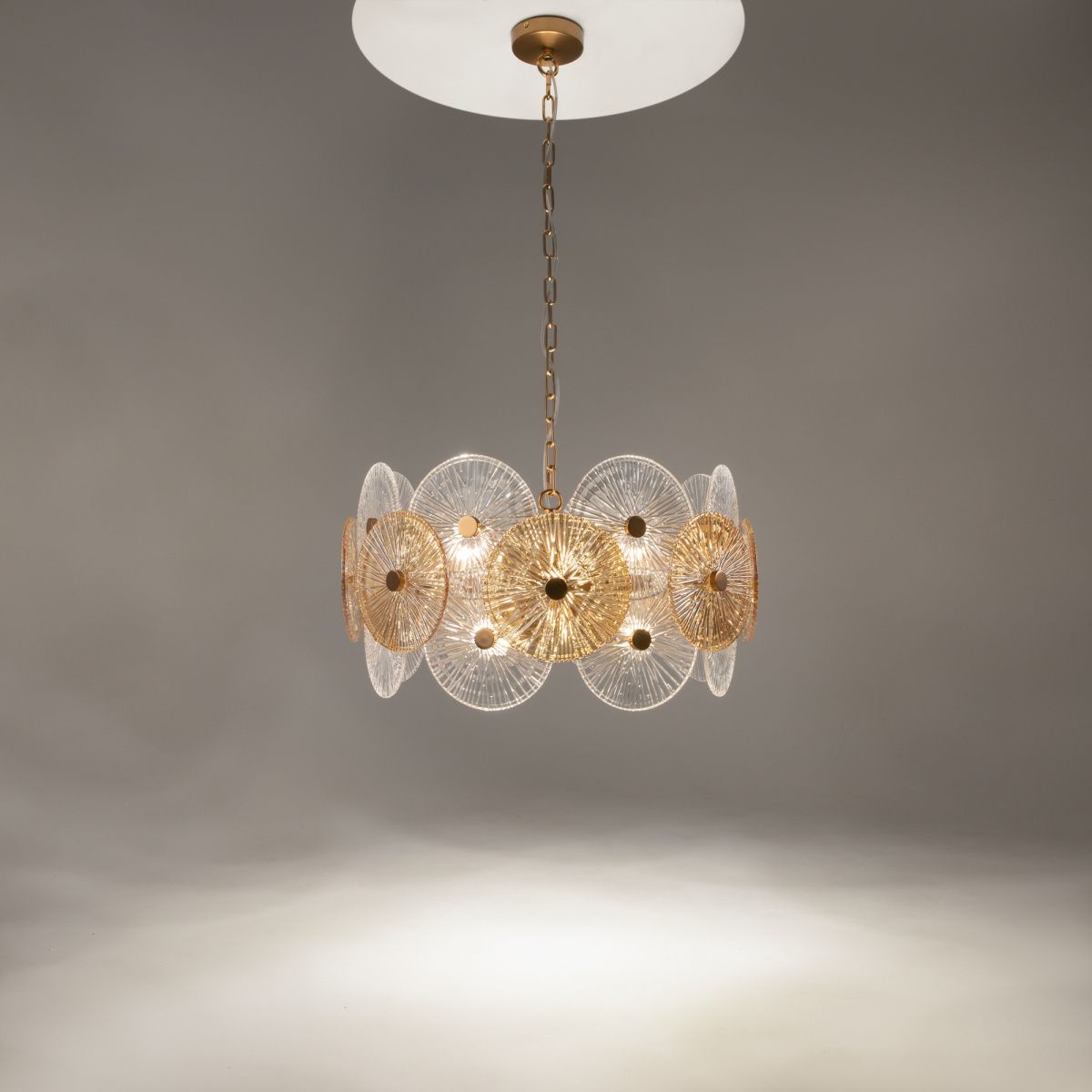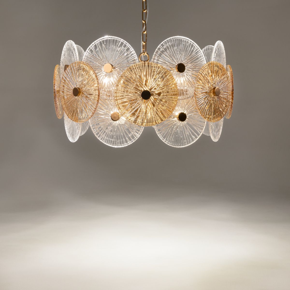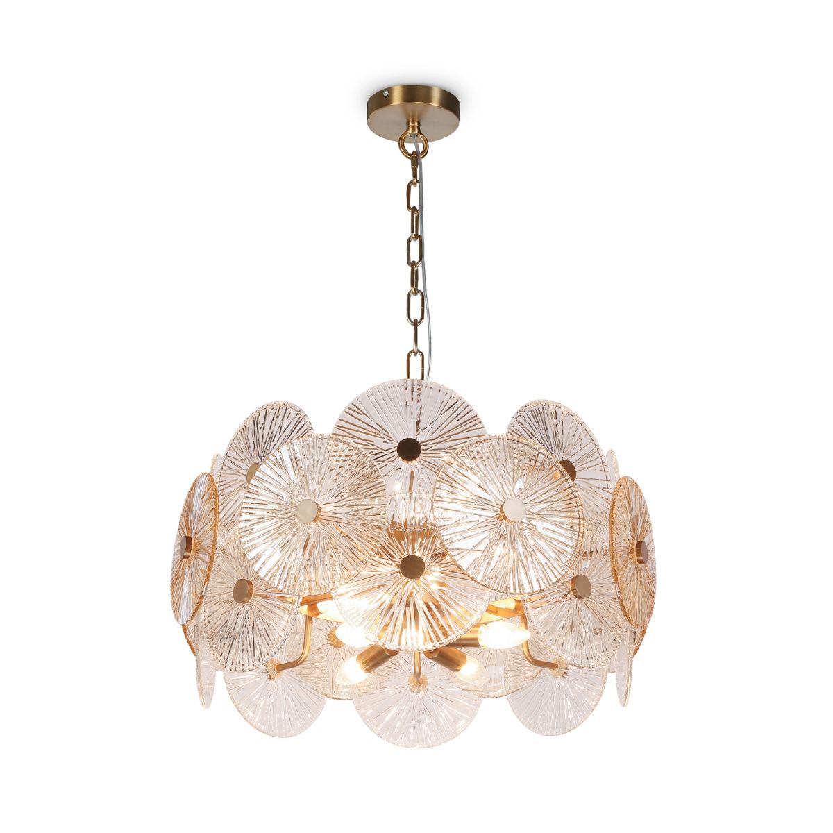 Металлическая арматура в золотом цвете. Сферический декор из штампованного рельефного стекла. Комбинация янтарного и прозрачного оттенка в декоре. Регулируемая высота.
