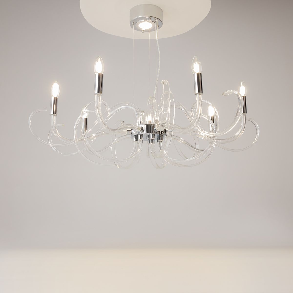 Материал арматуры – металл, цвет – хром. Декоративные рожки из прозрачного стекла. Трендовые обтекаемые формы в дизайне. Высота подвесных люстр регулируется тросом.
