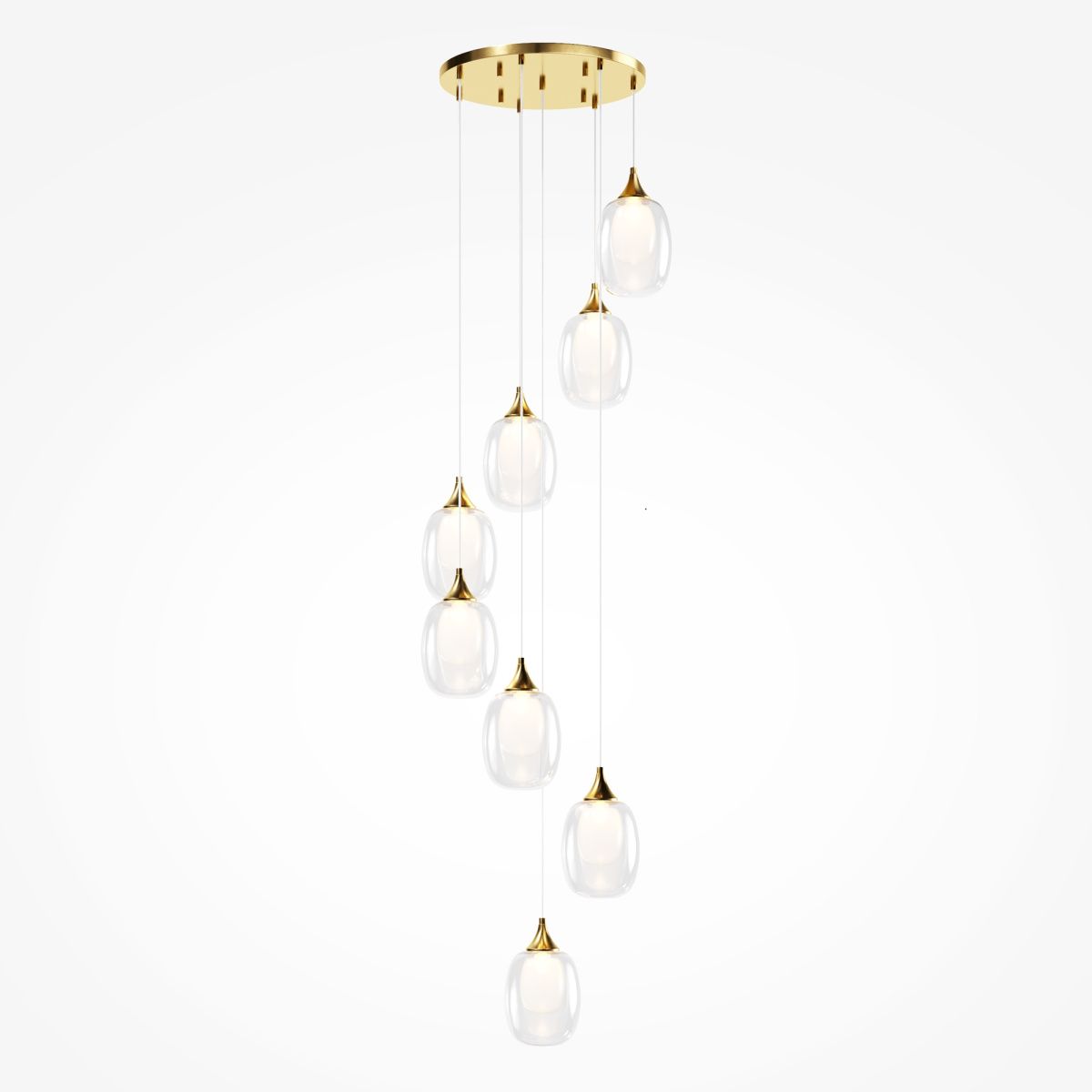 Металлическая арматура, цвет — латунь. Плафоны — двойное выдувное стекло. Внутренняя часть – матовая, внешняя – прозрачная. Элегантная неоклассика, трендовые округлые формы. Прозрачный провод длиной 3 метра подходит для помещений с высокими потолками. Регулируемая высота светильника для удобного размещения.