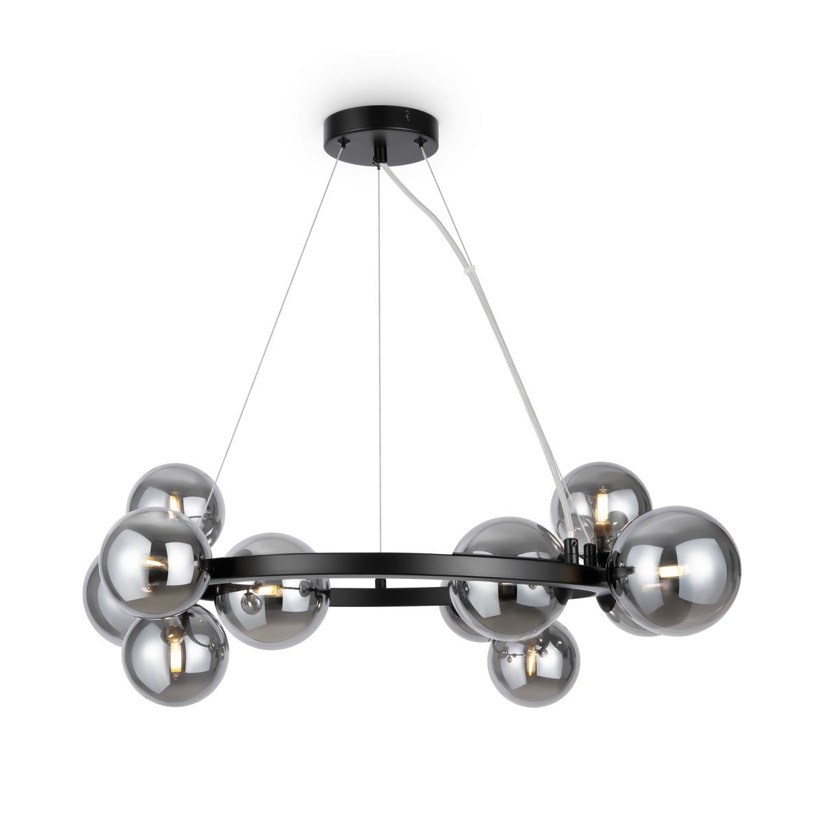 Металлическая арматура в четырех цветах: матовый черный, хром, золото, латунь. Плафоны — выдувное стекло. Цвета — дымчатый, янтарный, коньячный. Дизайн с имитацией молекулярной структуры. Высота подвесных светильников регулируется тросом. Лампа с цоколем G9.