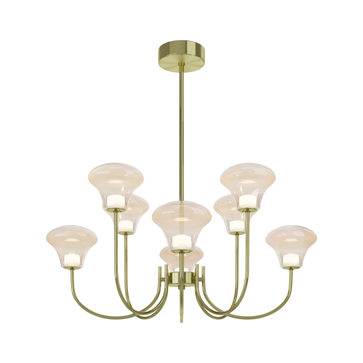 Серия Dynasty вдохновлена атмосферой бальных залов и представлена подвесными светильниками (люстры) на 6 и 8 плафонов, настенным светильником (бра).  Обтекаемая форма плафона с градиентом от янтарного к прозрачному. Арочный дизайн металлической арматуры в цвете сатинированной латуни. Блеск металла и глянец стекла дополнены светом LED-источника (3000K). Высота люстр регулируется разборной штангой.  Светильники Dynasty станут ярким акцентом в гостиной, столовой, спальне, рабочем кабинете или прихожей.