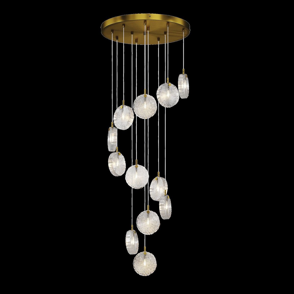 Материал арматуры - металл, цвет - латунь. Серия вдохновлена эстетикой северных лесов. Плафоны - литое цельное стекло в форме и фактуре среза дерева. Три варианта цвета плафонов: прозрачный;  прозрачный + матовый; прозрачный + матовый + изумрудный. Эстетичные крепления и магнитная  потолочная чаша без видимых болтов. Готовые композиции из 1, 5, 7 и 12 плафонов. Источник света -  лампа с цоколем G4.